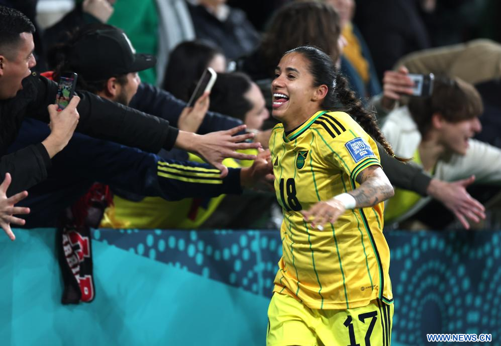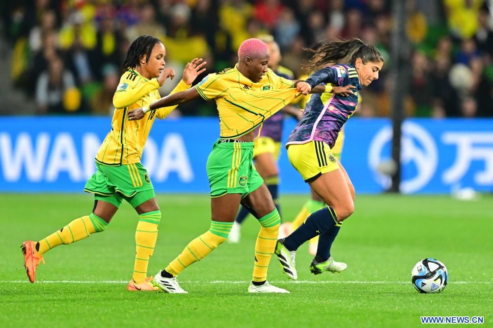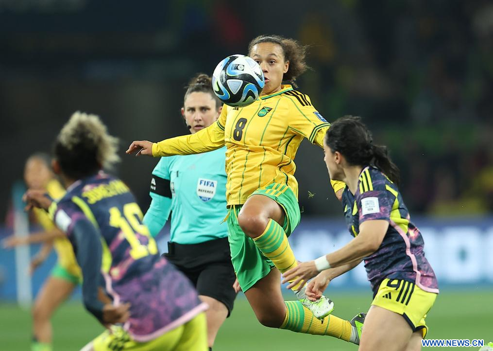MELBOURNE, 8 agosto, 2023 (Xinhua) -- Drew Spence (arriba), de Jamaica, detiene el balón durante el partido de octavos de final entre Colombia y Jamaica en la Copa Mundial Femenina de la FIFA Australia y Nueva Zelanda 2023, en Melbourne, Australia, el 8 de agosto de 2023. (Xinhua/Ding Xu)