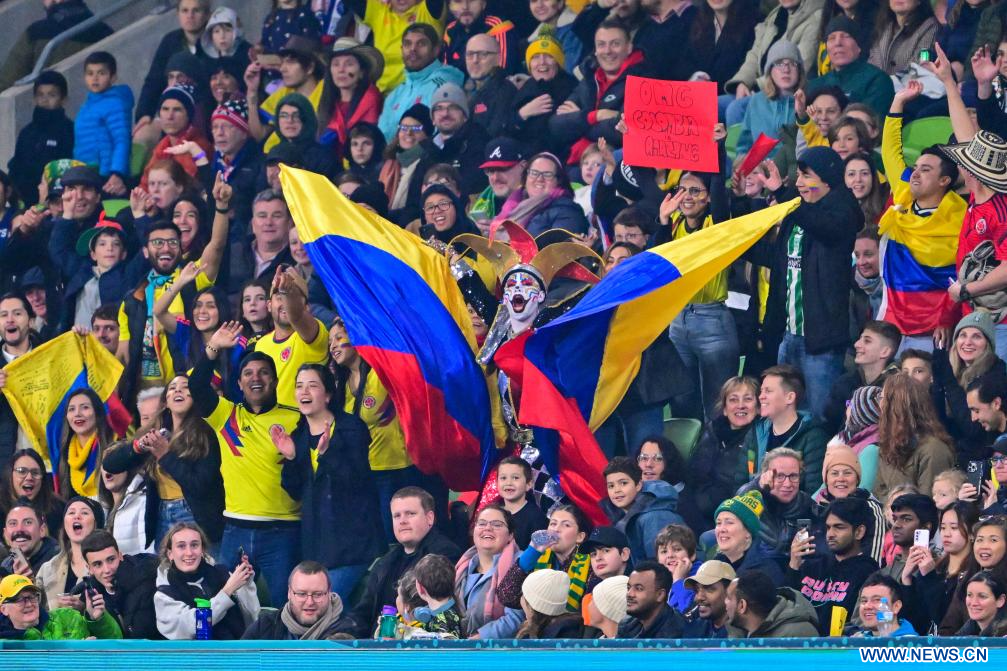 MELBOURNE, 8 agosto, 2023 (Xinhua) -- Aficionados de Colombia animan durante el partido de octavos de final entre Colombia y Jamaica en la Copa Mundial Femenina de la FIFA Australia y Nueva Zelanda 2023, en Melbourne, Australia, el 8 de agosto de 2023. (Xinhua/Zhu Wei)