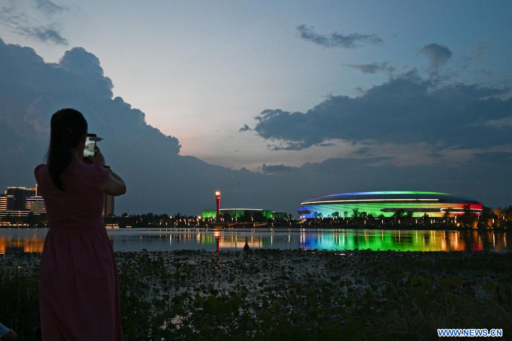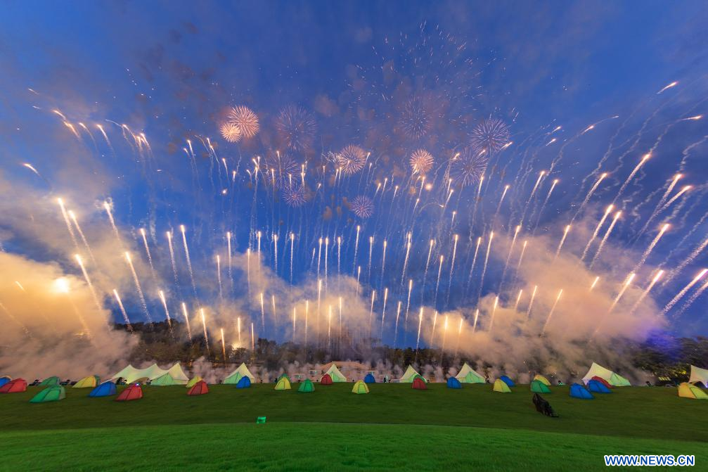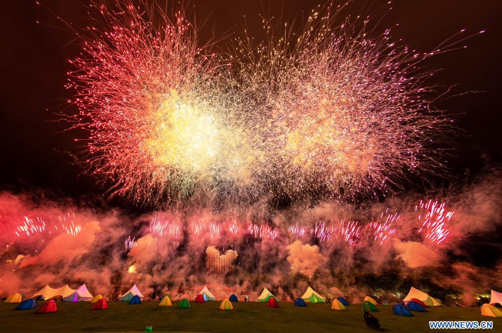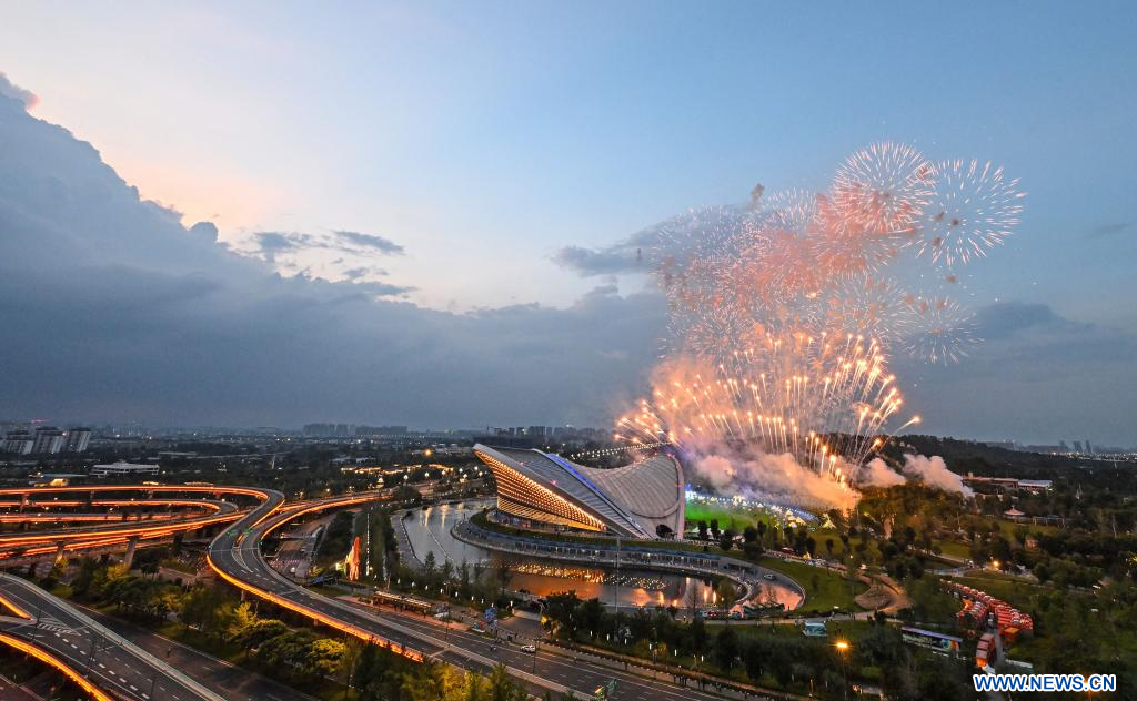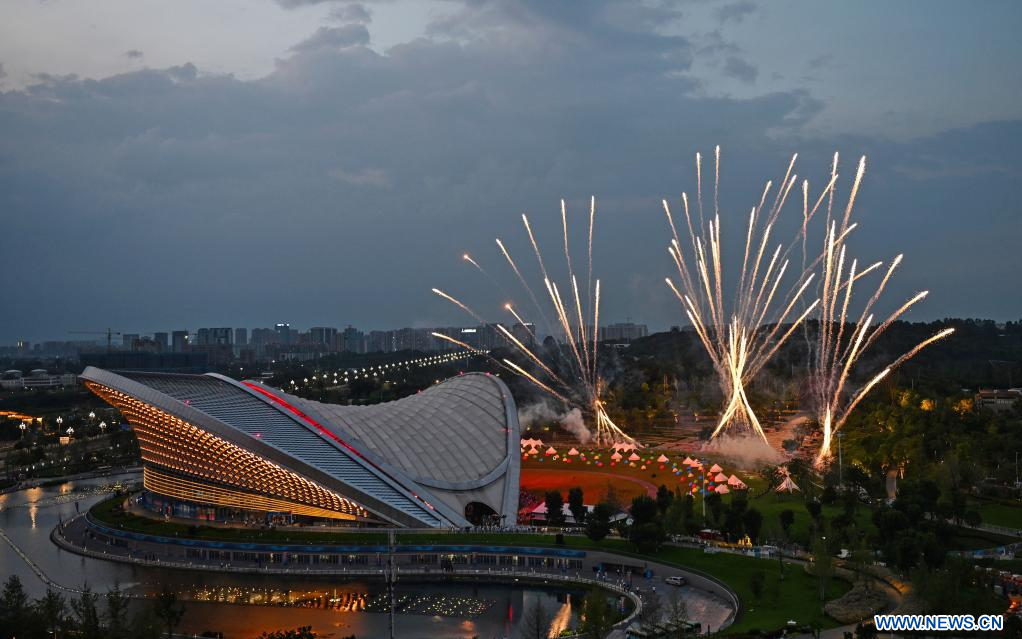 CHENGDU, 8 agosto, 2023 (Xinhua) -- Fuegos artificiales son vistos durante la ceremonia de clausura de la 31ª edición de verano de los Juegos Mundiales Universitarios de la FISU, en Chengdu, en la provincia de Sichuan, en el suroeste de China, el 8 de agosto de 2023. (Xinhua/Huang Wei)