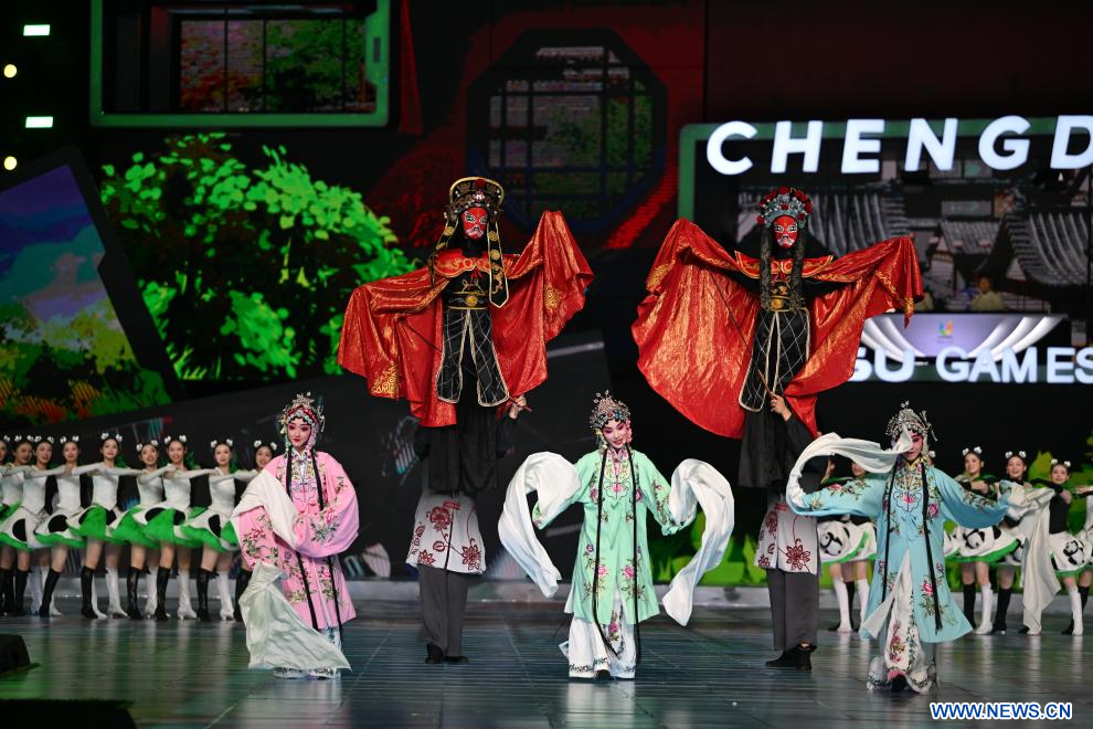 CHENGDU, 8 agosto, 2023 (Xinhua) -- Músicos realizan una presentación durante la ceremonia de clausura de la 31ª edición de verano de los Juegos Mundiales Universitarios de la FISU, en Chengdu, en la provincia de Sichuan, en el suroeste de China, el 8 de agosto de 2023. (Xinhua/Zhang Duan)