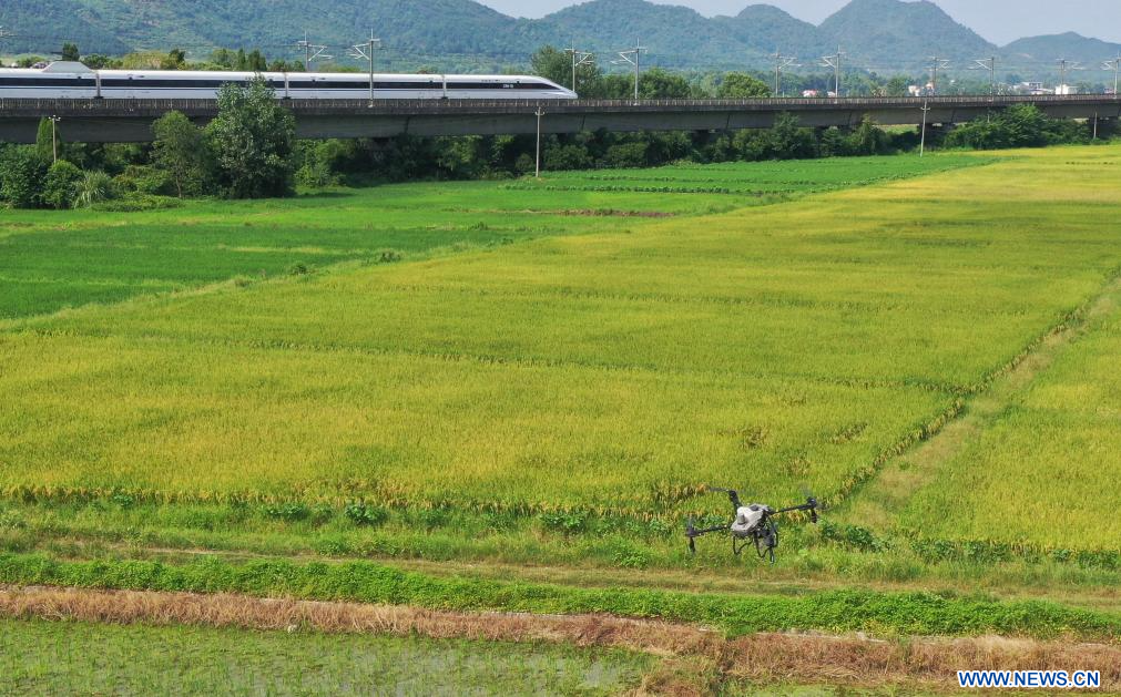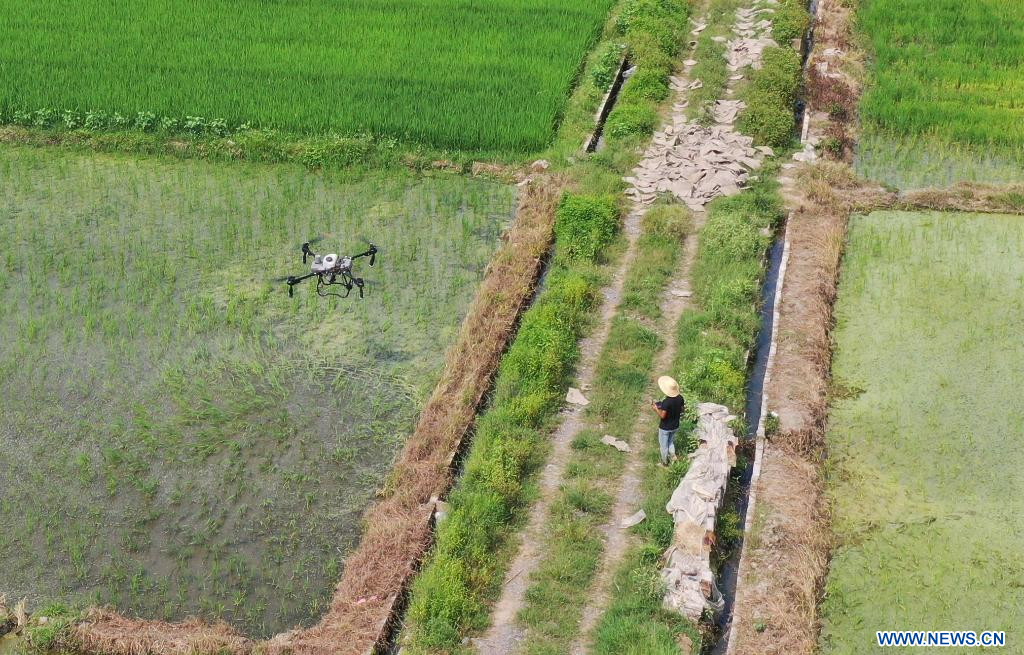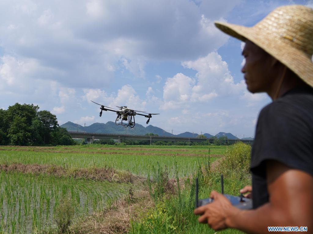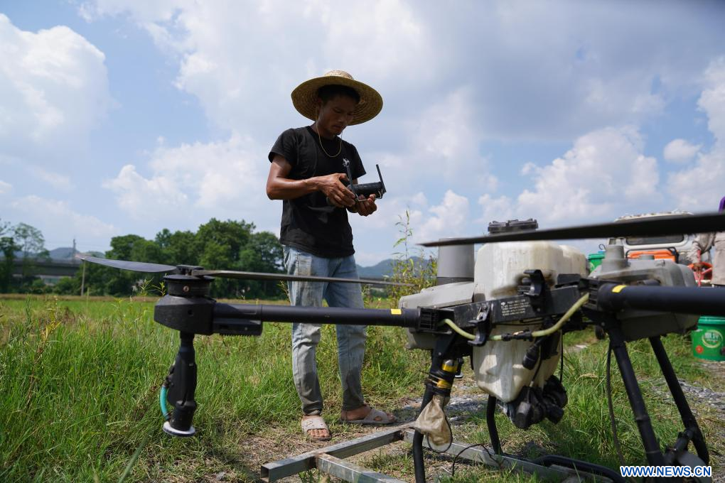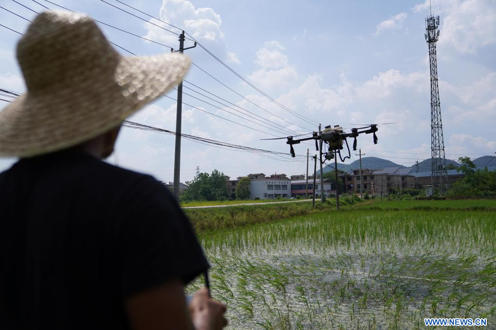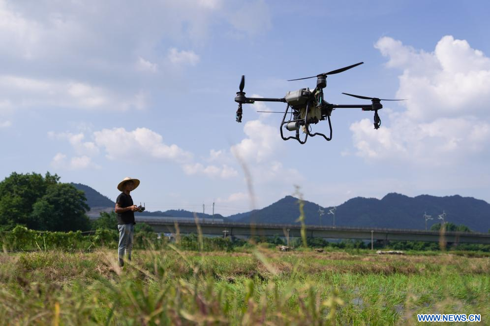 XINYU, 4 agosto, 2023 (Xinhua) -- Imagen del 3 de agosto de 2023 de un agricultor operando un dron para rociar fertilizante en el campo, en el distrito de Fenyi de la ciudad de Xinyu, en la provincia de Jiangxi, en el este de China. La aplicación de máquinas agrícolas como trasplantadoras de arroz y drones ha impulsado la eficiencia agrícola en el distrito de Fenyi. El área de cultivo de arroz tardío en Fenyi ha llegado a 122.000 mu (alrededor de 8.133 hectáreas), logrando una tasa de mecanización del 83,44 por ciento. (Xinhua/Zhou Mi)