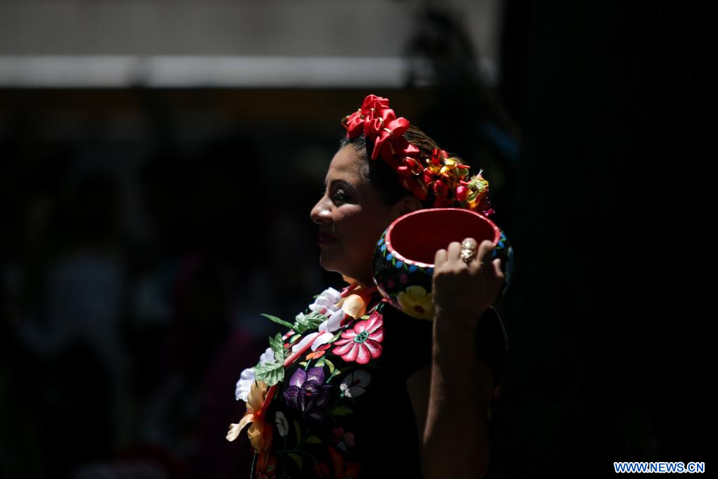 CIUDAD DE MÉXICO, 9 agosto, 2023 (Xinhua) -- Una mujer participa en un evento denominado "Megacalenda" realizado con motivo del Día Internacional de los Pueblos Indígenas, en la Ciudad de México, capital de México, el 9 de agosto de 2023. El Día Internacional de los Pueblos Indígenas se conmemora anualmente el 9 de agosto. (Xinhua/Francisco Cañedo)