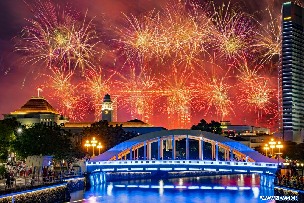 SINGAPUR, 9 agosto, 2023 (Xinhua) -- Fuegos artificiales iluminan el cielo durante el Desfile del Día Nacional, en el Padang de Singapur, el 9 de agosto de 2023. Singapur realizó un Desfile del Día Nacional el miércoles para celebrar su 58° aniversario en el Padang, un campo de juego abierto cerca de la icónica Marina Bay, con un espectáculo militar, actuaciones y fuegos artificiales. (Xinhua/Then Chih Wey)