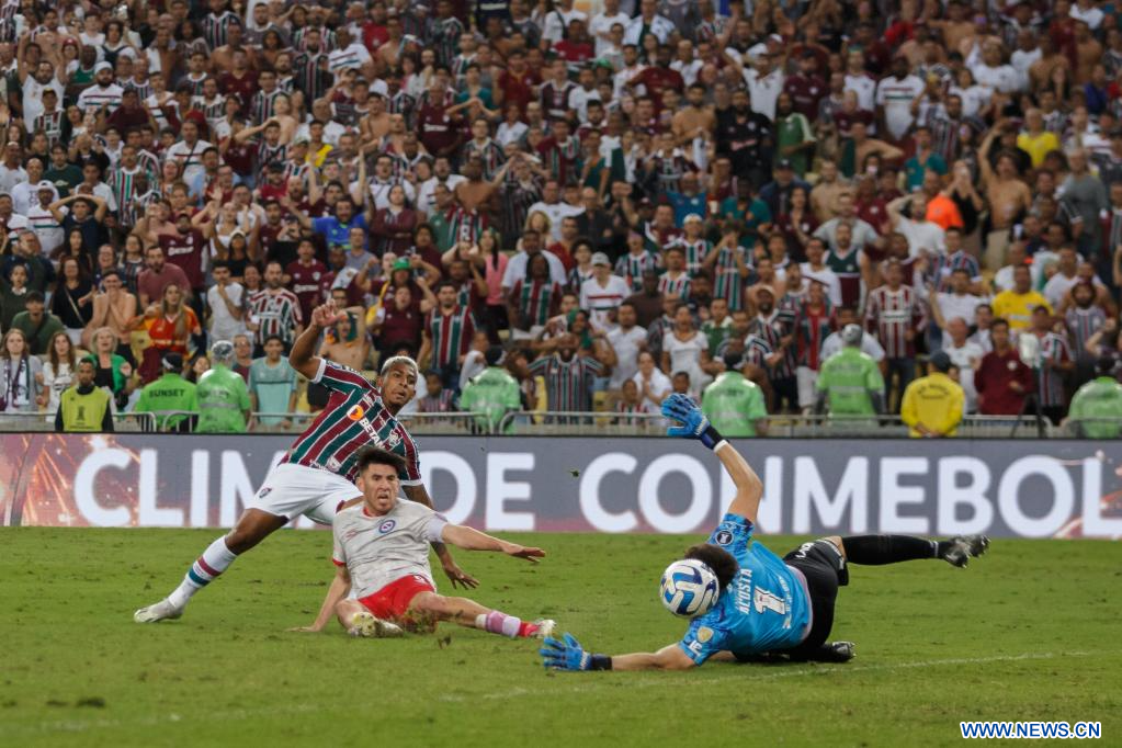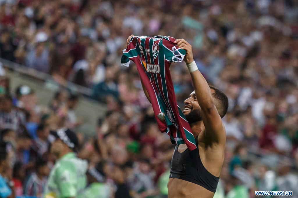RÍO DE JANEIRO, 9 agosto, 2023 (Xinhua) -- Imagen del 8 de agosto de 2023 del jugador Samuel, de Fluminense de Brasil, festejando su anotación durante el partido de vuelta correspondiente a los octavos de final de la Copa Libertadores de América ante Argentinos Juniors de Argentina, celebrado en el Estadio Maracaná, en Río de Janeiro, Brasil. (Xinhua/Claudia Martini)