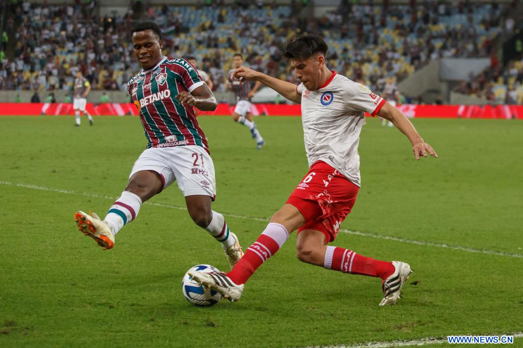 RÍO DE JANEIRO, 9 agosto, 2023 (Xinhua) -- Imagen del 8 de agosto de 2023 del jugador Jhon Arias (i), de Fluminense de Brasil, disputando el balón con Lucas Villalba (d), de Argentinos Juniors de Argentina, durante el partido de vuelta correspondiente a los octavos de final de la Copa Libertadores de América, celebrado en el Estadio Maracaná, en Río de Janeiro, Brasil. (Xinhua/Claudia Martini)
