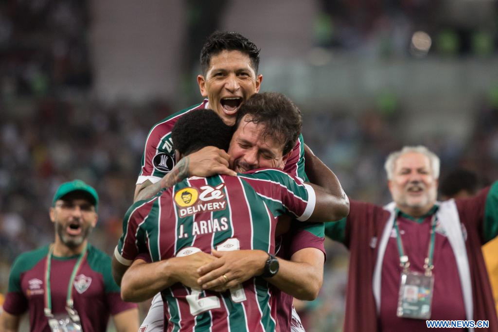 RÍO DE JANEIRO, 9 agosto, 2023 (Xinhua) -- Imagen del 8 de agosto de 2023 de los jugadores Germán Cano (atrás), Jhon Arias (frente) y el director técnico Fernando Diniz (c), de Fluminense de Brasil, festejando al término del partido de vuelta correspondiente a los octavos de final de la Copa Libertadores de América ante Argentinos Juniors de Argentina, celebrado en el Estadio Maracaná, en Río de Janeiro, Brasil. (Xinhua/Claudia Martini)