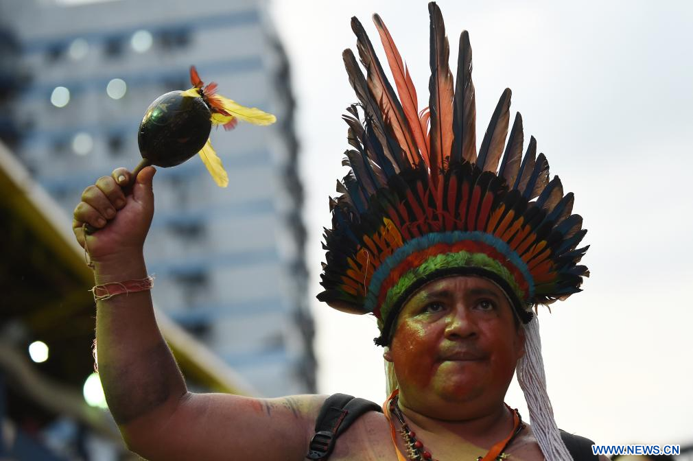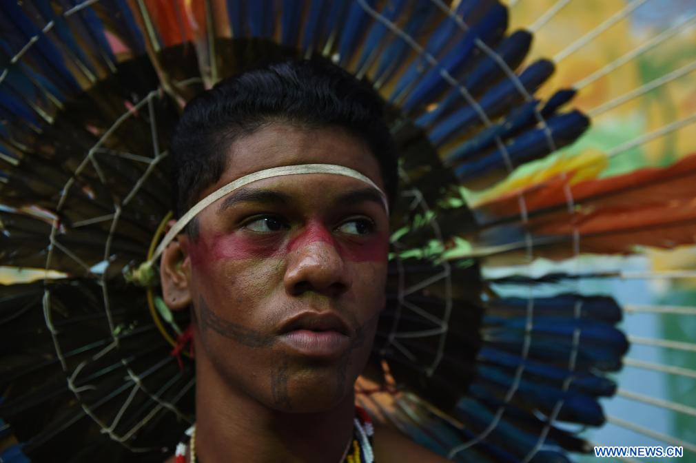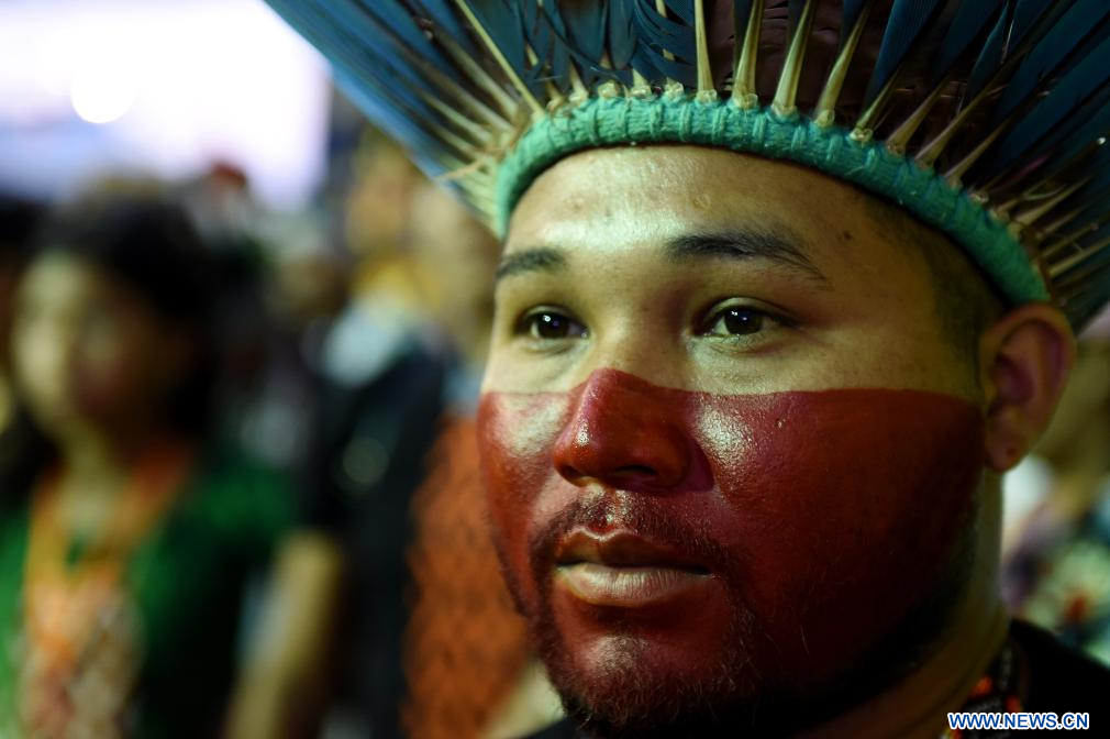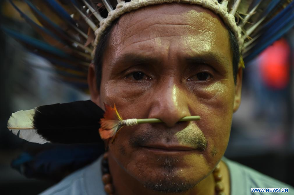 BELEM, 8 agosto, 2023 (Xinhua) -- Un indígena asiste a la Asamblea de los Pueblos de la Tierra para la Amazonia, en Belém, capital del estado de Pará, Brasil, el 7 de agosto de 2023. (Xinhua/Lucio Tavora)
