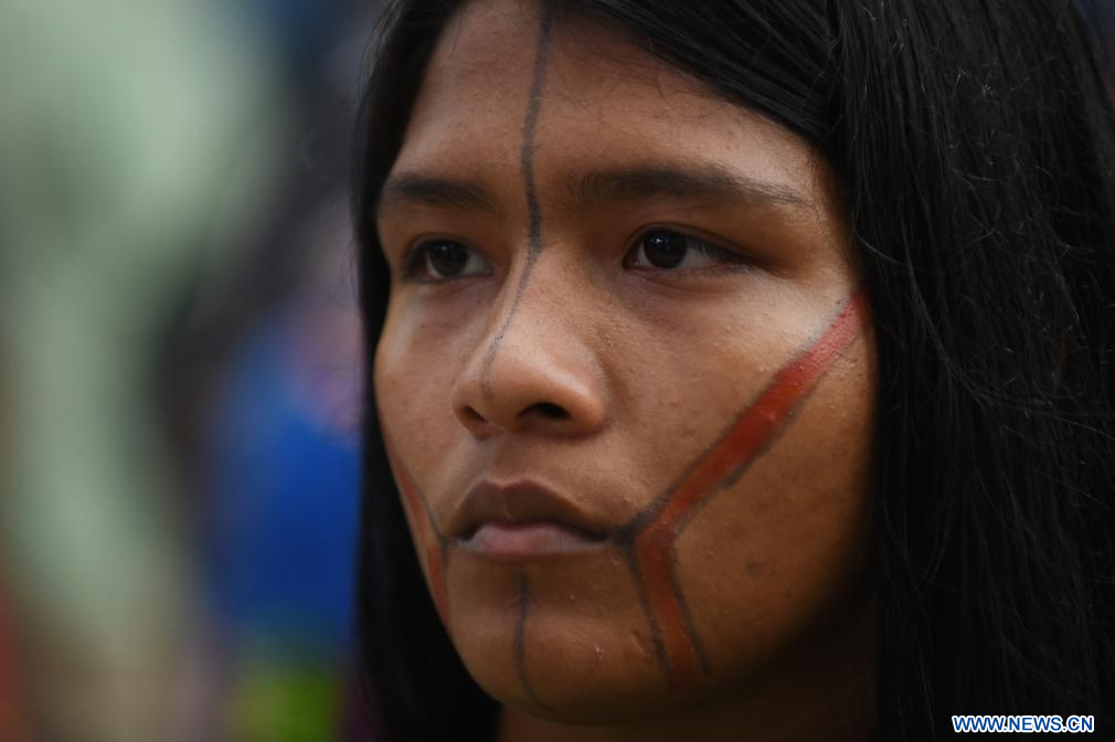BELEM, 8 agosto, 2023 (Xinhua) -- Una indígena asiste a la Asamblea de los Pueblos de la Tierra para la Amazonia, en Belém, capital del estado de Pará, Brasil, el 7 de agosto de 2023. (Xinhua/Lucio Tavora)