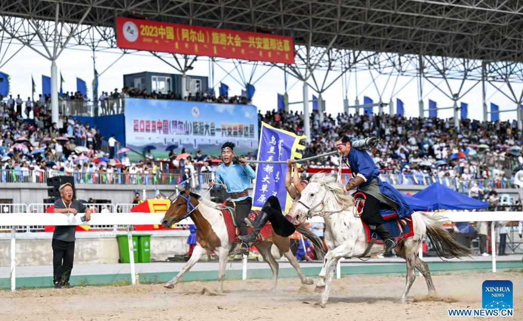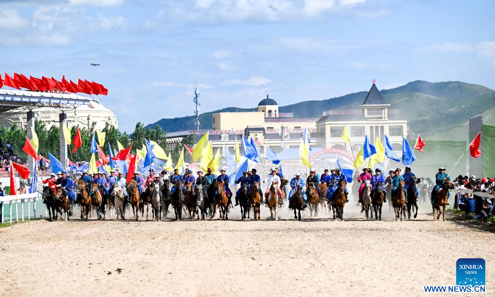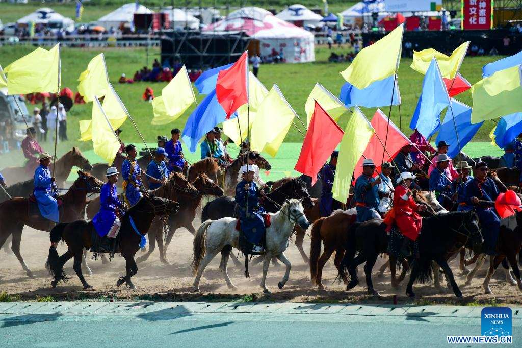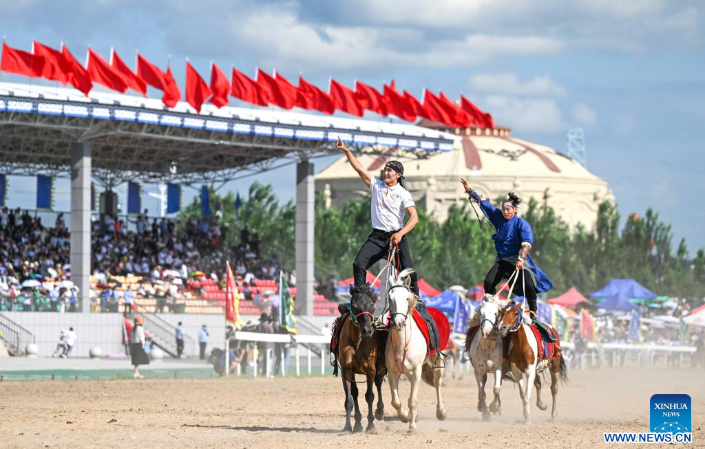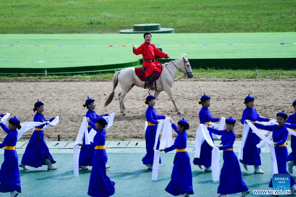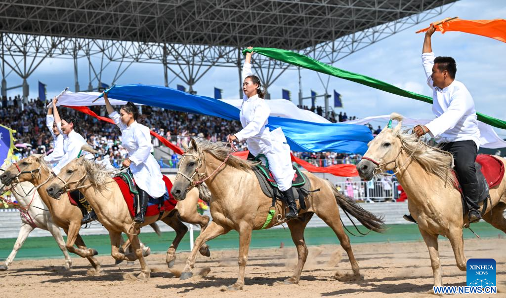 LIGA DE HINGGAN, 9 agosto, 2023 (Xinhua) -- Artistas participan en la ceremonia de apertura de una feria Nadam, en la bandera frontal del ala derecha de Horqin, en la liga de Hinggan, en la región autónoma de Mongolia Interior, en el norte de China, el 9 de agosto de 2023. Una feria Nadam comenzó aquí el miércoles y durará hasta el 12 de agosto. Una variedad de actividades como carreras de caballos, competencia de lucha libre, concurso de tiro con arco y un festival de música se llevarán a cabo durante el evento. (Xinhua/Li Zhipeng)