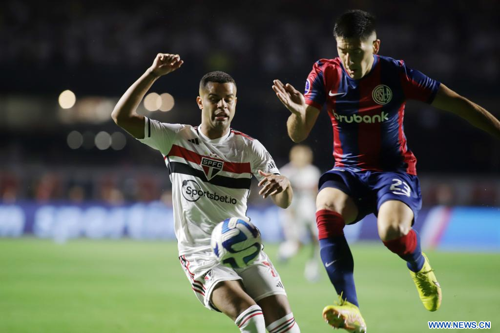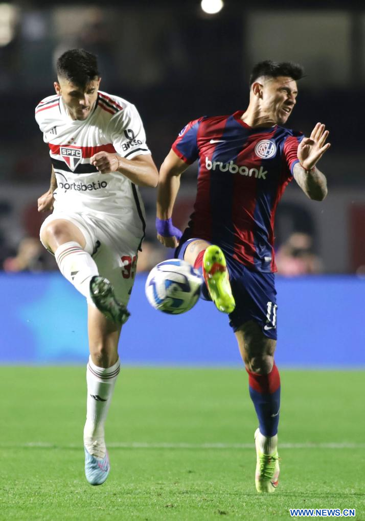 SAO PAULO, 11 agosto, 2023 (Xinhua) -- Imagen del 10 de agosto de 2023 del jugador Beraldo (i), de Sao Paulo de Brasil, disputando el balón con Adam Bareiro (d), de San Lorenzo de Argentina, durante el partido de vuelta de los octavos de final de la Copa Conmebol Sudamericana 2023, celebrado en el Estadio Morumbi, en Sao Paulo, Brasil. (Xinhua/Rahel Patrasso)