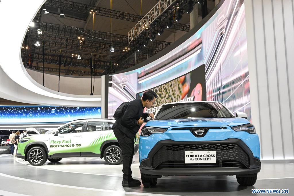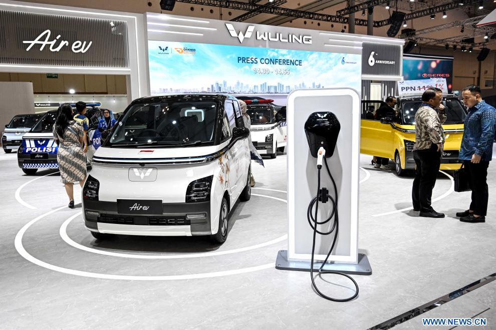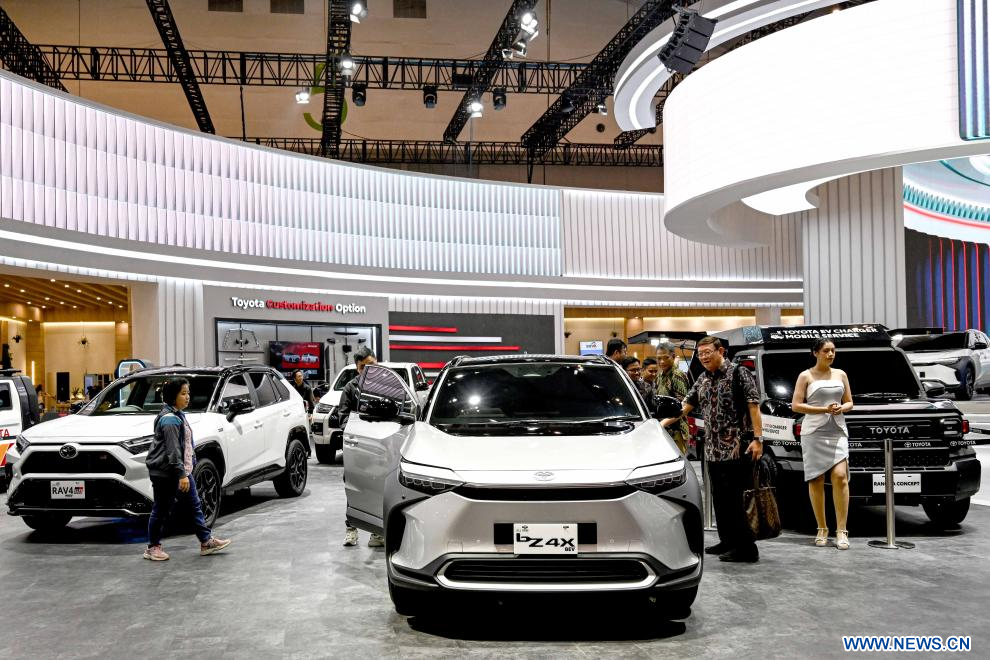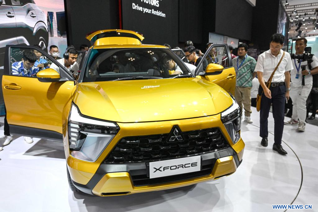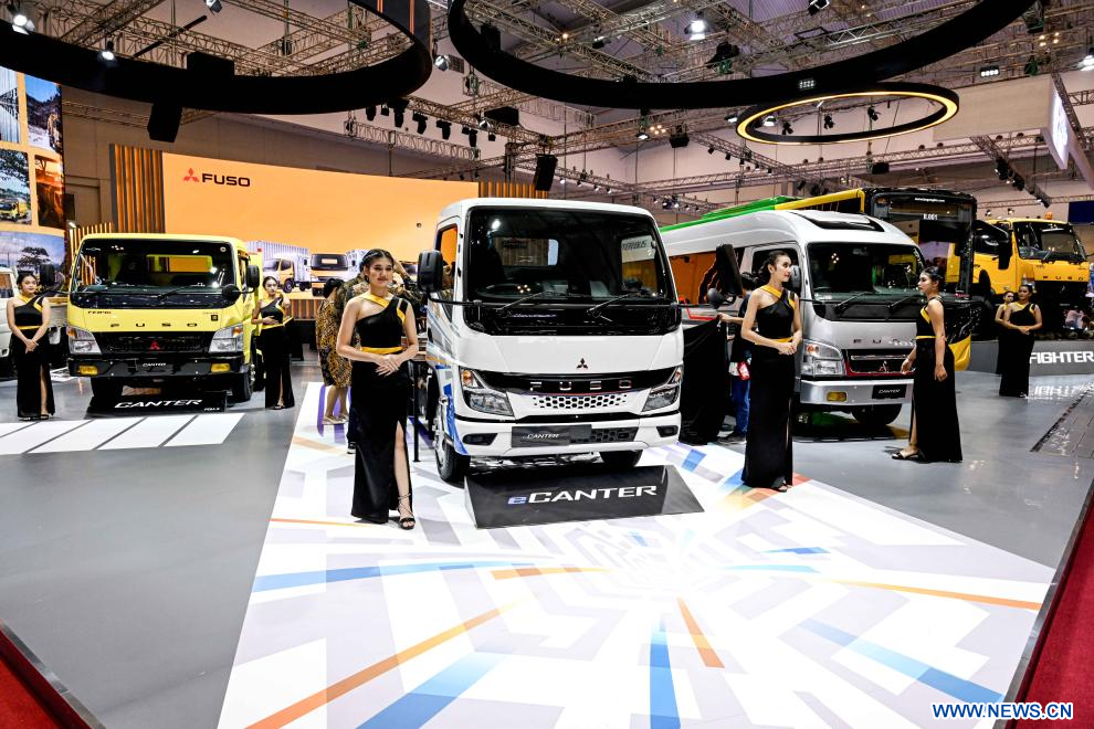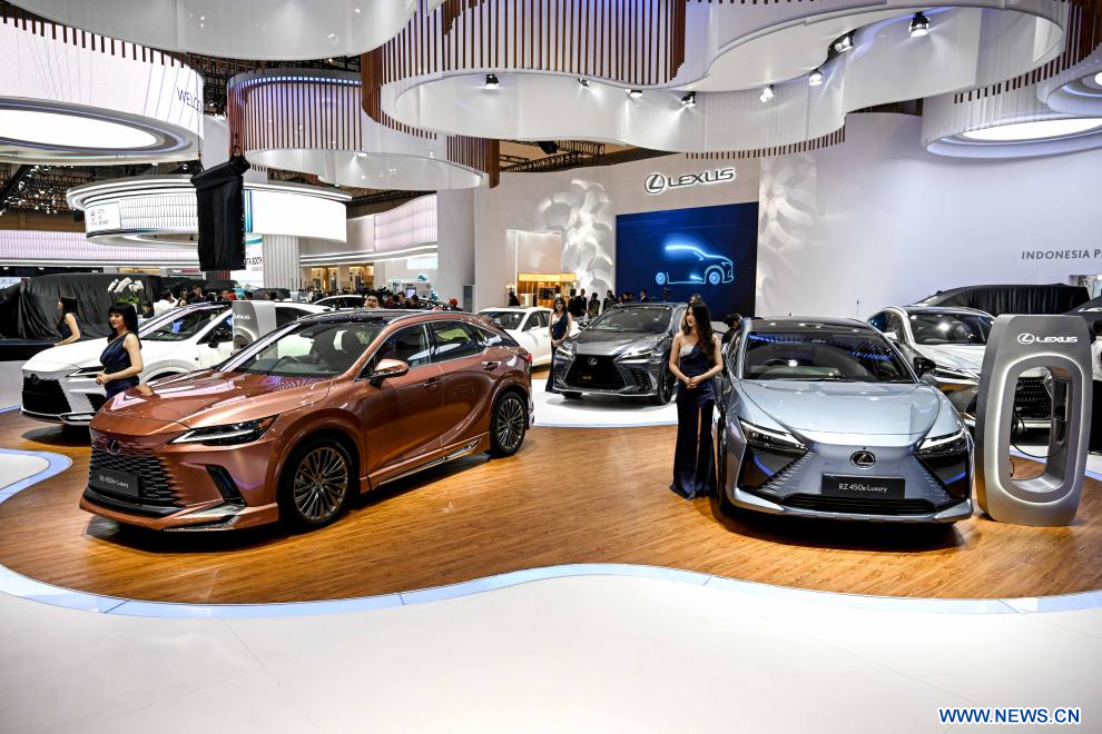 TANGERANG, 10 agosto, 2023 (Xinhua) -- Modelos permanecen de pie junto a los vehículos exhibidos en el Salón Internacional del Automóvil de GAIKINDO Indonesia (GIIAS, por sus siglas en inglés) 2023, en Tangerang de la provincia de Banten, Indonesia, el 10 de agosto de 2023. El GIIAS 2023 se inauguró en Tangerang el jueves y durará hasta el 20 de agosto. (Xinhua/Agung Kuncahya B.)