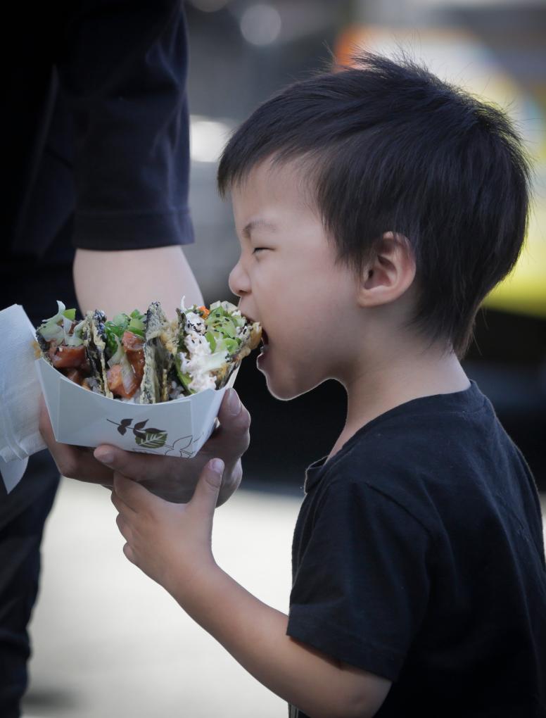 RICHMOND, 12 agosto, 2023 (Xinhua) -- Imagen del 11 de agosto de 2023 de un niño comiendo alimentos comprados en un camión de comida durante el Festival de la Fusión de Richmond, en Richmond, Columbia Británica, Canadá. El Festival de la Fusión de Richmond es un festival de camiones de comida en el que participan más de 20 camiones de comida que ofrecen diversos tipos de alimentos callejeros. El evento se lleva a cabo del 11 al 13 de agosto. (Xinhua/Liang Sen)