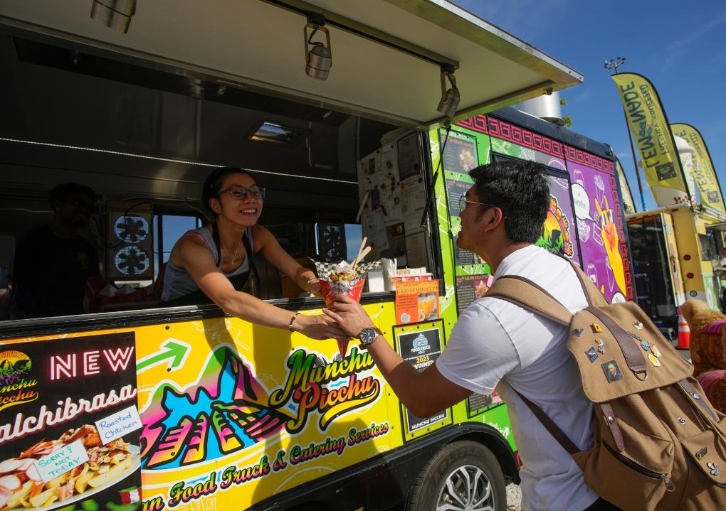 RICHMOND, 12 agosto, 2023 (Xinhua) -- Imagen del 11 de agosto de 2023 de un cliente comprando alimentos en un camión de comida durante el Festival de la Fusión de Richmond, en Richmond, Columbia Británica, Canadá. El Festival de la Fusión de Richmond es un festival de camiones de comida en el que participan más de 20 camiones de comida que ofrecen diversos tipos de alimentos callejeros. El evento se lleva a cabo del 11 al 13 de agosto. (Xinhua/Liang Sen)