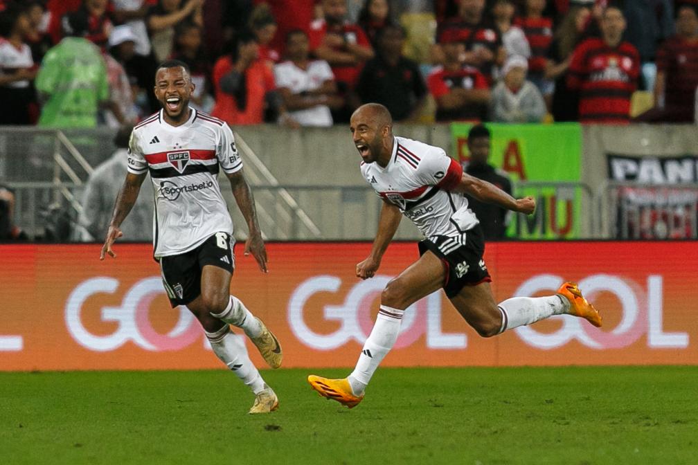 RIO DE JANEIRO, 14 agosto, 2023 (Xinhua) -- Imagen del 13 de agosto de 2023 del jugador Lucas Moura (d), de Sao Paulo, festejando su anotación junto a su compañero Wellington (i) durante el partido correspondiente al Campeonato Brasileño 2023-Serie A, ante Flamengo, celebrado en el Estadio Maracaná, en Río de Janeiro, Brasil. (Xinhua/Claudia Martini)