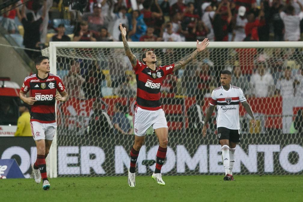 RIO DE JANEIRO, 14 agosto, 2023 (Xinhua) -- Imagen del 13 de agosto de 2023 del jugador Pedro (c), de Flamengo, festejando su anotación durante el partido correspondiente al Campeonato Brasileño 2023-Serie A, ante Sao Paulo, celebrado en el Estadio Maracaná, en Río de Janeiro, Brasil. (Xinhua/Claudia Martini)