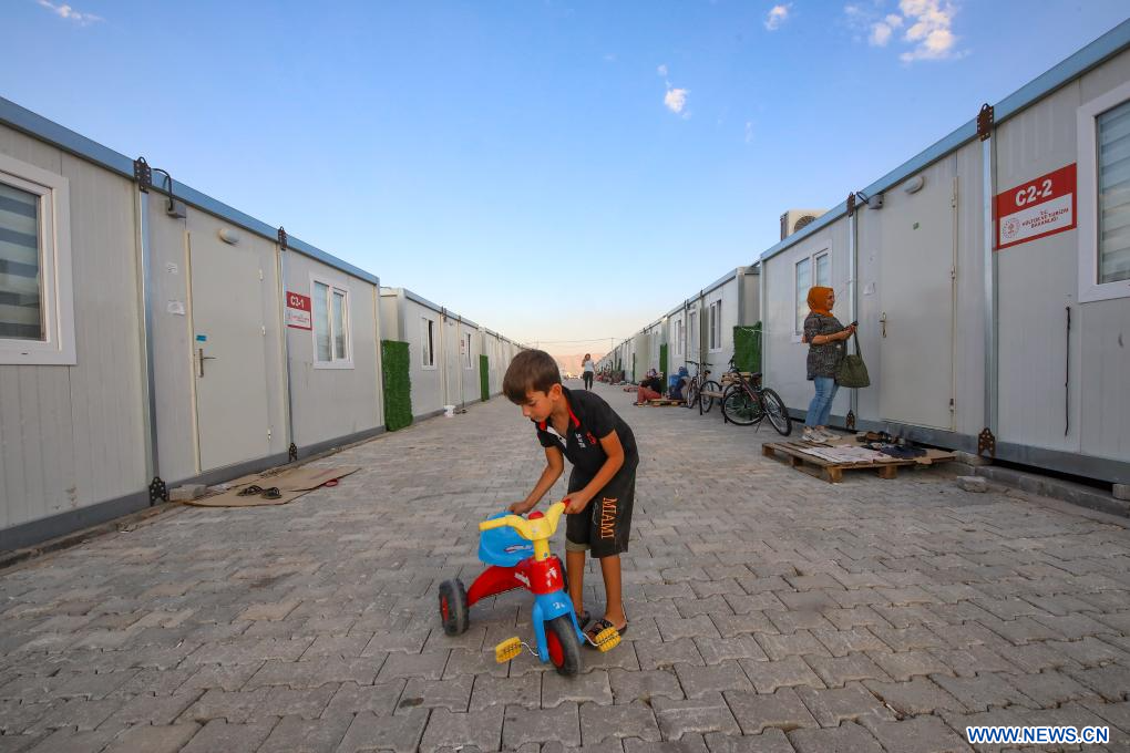 MALATYA, 1 agosto, 2023 (Xinhua) -- Imagen del 31 de julio de 2023 de un niño jugando con un triciclo en una "ciudad de contenedores" en la provincia de Malatya, afectada por el terremoto, Turquía. Casi seis meses después de los mortíferos terremotos que devastaron el sur de Turquía, los sobrevivientes han comenzado a trasladarse a una "ciudad de contenedores", un nuevo asentamiento compuesto por viviendas prefabricadas que se asemejan a contenedores de transporte. (Xinhua/Mustafa Kaya)