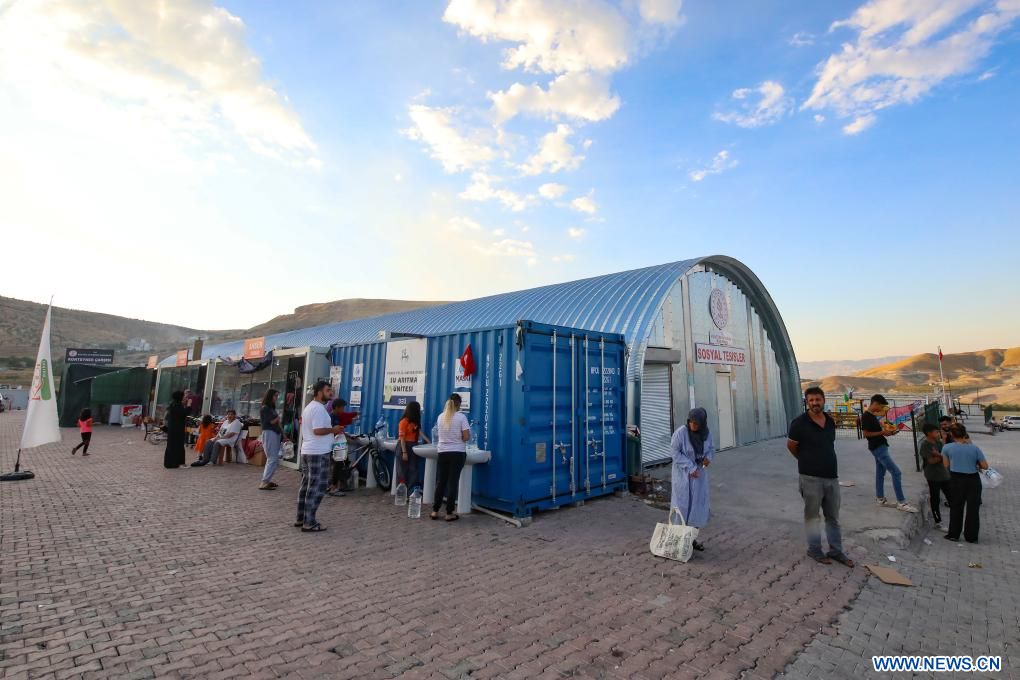 MALATYA, 1 agosto, 2023 (Xinhua) -- Imagen del 31 de julio de 2023 de una "ciudad de contenedores", en la provincia de Malatya, afectada por el terremoto, Turquía. Casi seis meses después de los mortíferos terremotos que devastaron el sur de Turquía, los sobrevivientes han comenzado a trasladarse a una "ciudad de contenedores", un nuevo asentamiento compuesto por viviendas prefabricadas que se asemejan a contenedores de transporte. (Xinhua/Mustafa Kaya)