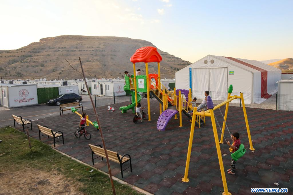 MALATYA, 1 agosto, 2023 (Xinhua) -- Imagen del 31 de julio de 2023 de niños jugando en una "ciudad de contenedores" en la provincia de Malatya, afectada por el terremoto, Turquía. Casi seis meses después de los mortíferos terremotos que devastaron el sur de Turquía, los sobrevivientes han comenzado a trasladarse a una "ciudad de contenedores", un nuevo asentamiento compuesto por viviendas prefabricadas que se asemejan a contenedores de transporte. (Xinhua/Mustafa Kaya)