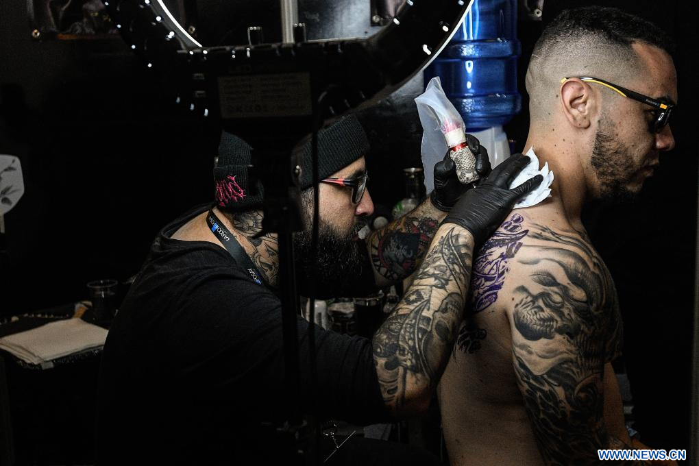 VALPARAISO, 12 agosto, 2023 (Xinhua) -- Un tatuador realiza un tatuaje a un hombre durante la Feria Expositora de Tatuajes "Cicaplast Summer Ink 2023 - Edición Invierno", en Valparaíso, Chile, el 12 de agosto de 2023. (Xinhua/Jorge Villegas)