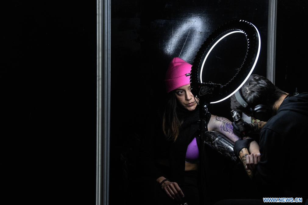 VALPARAISO, 12 agosto, 2023 (Xinhua) -- Un tatuador realiza un tatuaje a una mujer durante la Feria Expositora de Tatuajes "Cicaplast Summer Ink 2023 - Edición Invierno", en Valparaíso, Chile, el 12 de agosto de 2023. (Xinhua/Jorge Villegas)