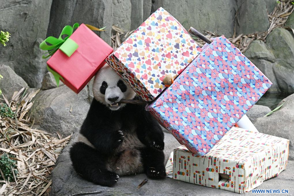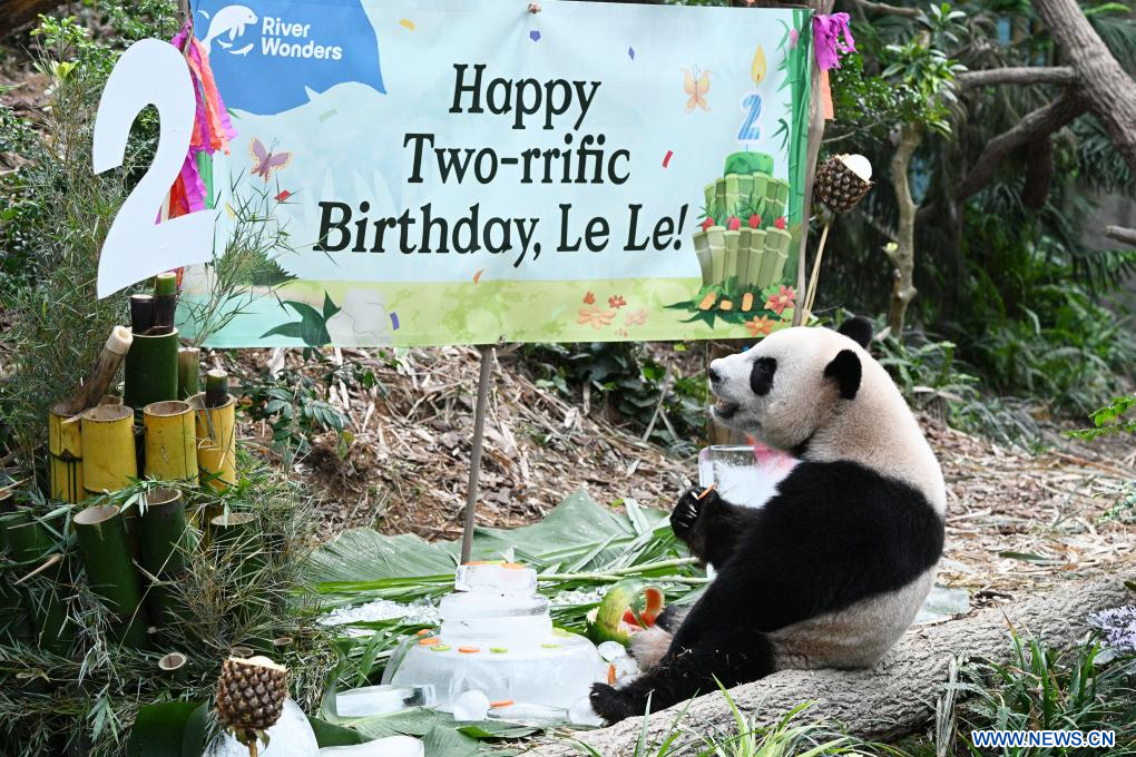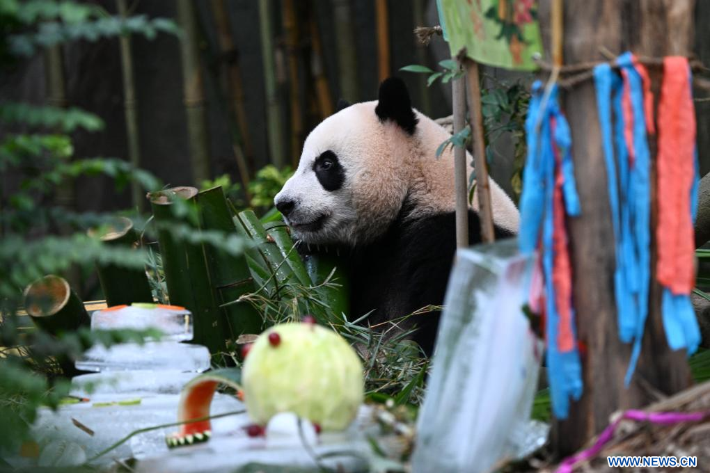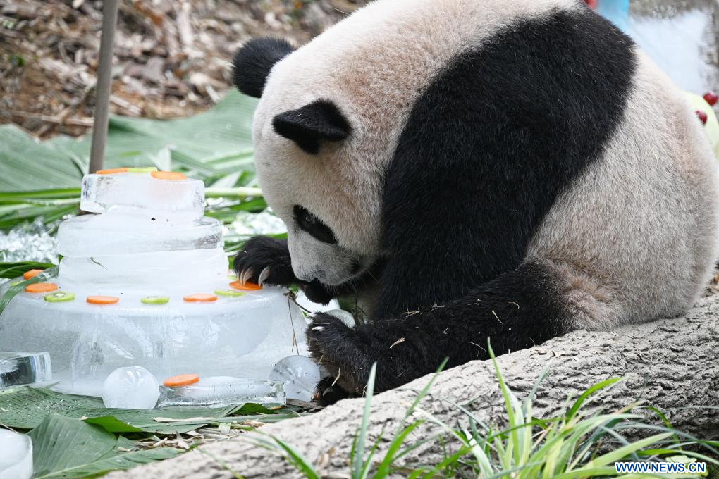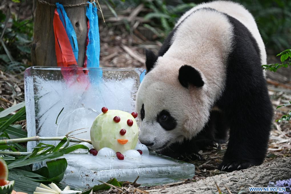 SINGAPUR, 14 agosto, 2023 (Xinhua) -- El panda gigante Le Le, el primer panda gigante nacido en Singapur, disfruta de la comida en su segunda fiesta de cumpleaños llevada a cabo en el River Wonders de Singapur, el 14 de agosto de 2023. (Xinhua/Then Chih Wey)