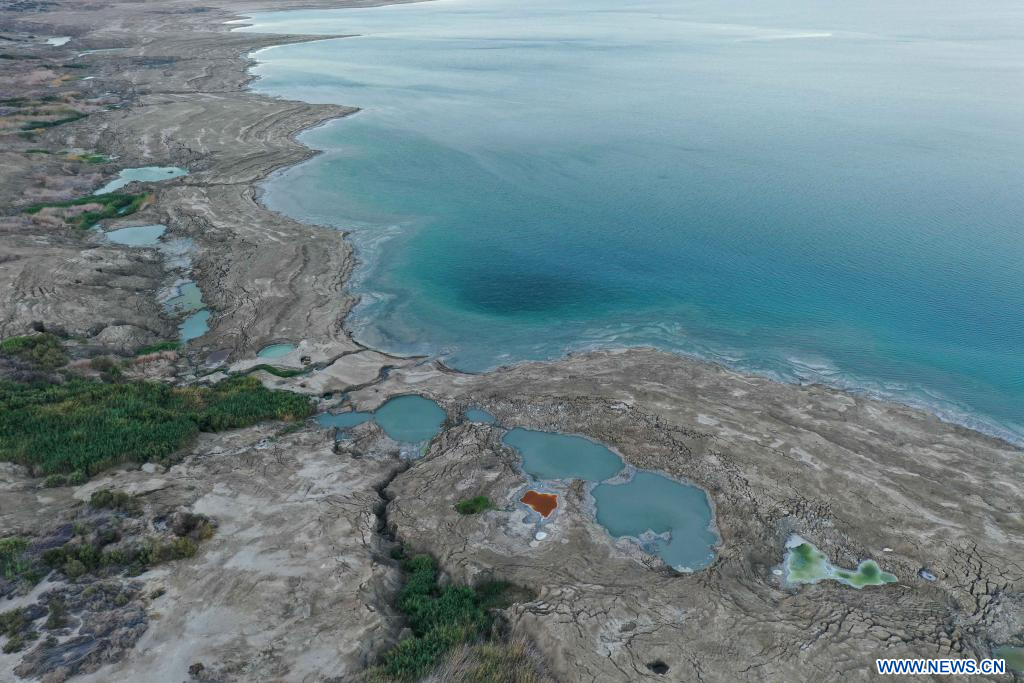 EIN GEDI, 7 agosto, 2023 (Xinhua) -- Vista aérea del 6 de agosto de 2023 de sumideros en la orilla del Mar Muerto, cerca de la playa de Ein Gedi, Israel. Las estadísticas mostraban que el Mar Muerto se había estado reduciendo a un ritmo alarmante, su nivel de agua bajaba 1,2 metros cada año. A medida que el agua retrocedía, apareció un paisaje estéril de roca salada y numerosos sumideros. (Xinhua/Gil Cohen Magen)