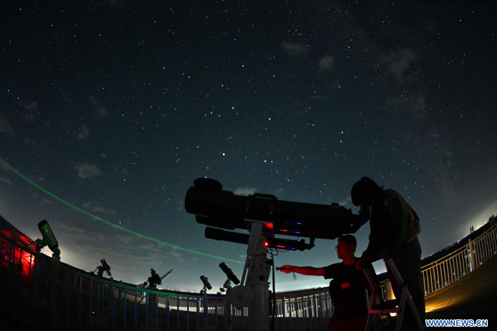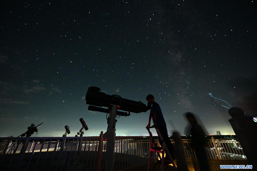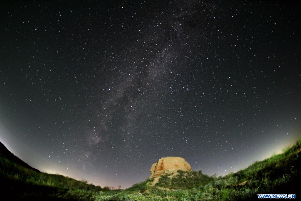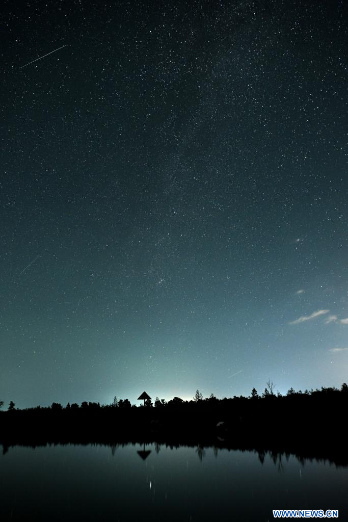 YINCHUAN, 13 agosto, 2023 (Xinhua) -- Imagen del 12 de agosto de 2023 de lluvia de meteoros Perseidas sobre la reserva natural del Lago Haba, en el distrito de Yanchi, en la región autónoma hui de Ningxia, en el noroeste de China. (Xinhua/Wang Peng)