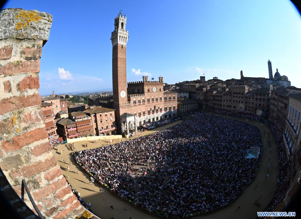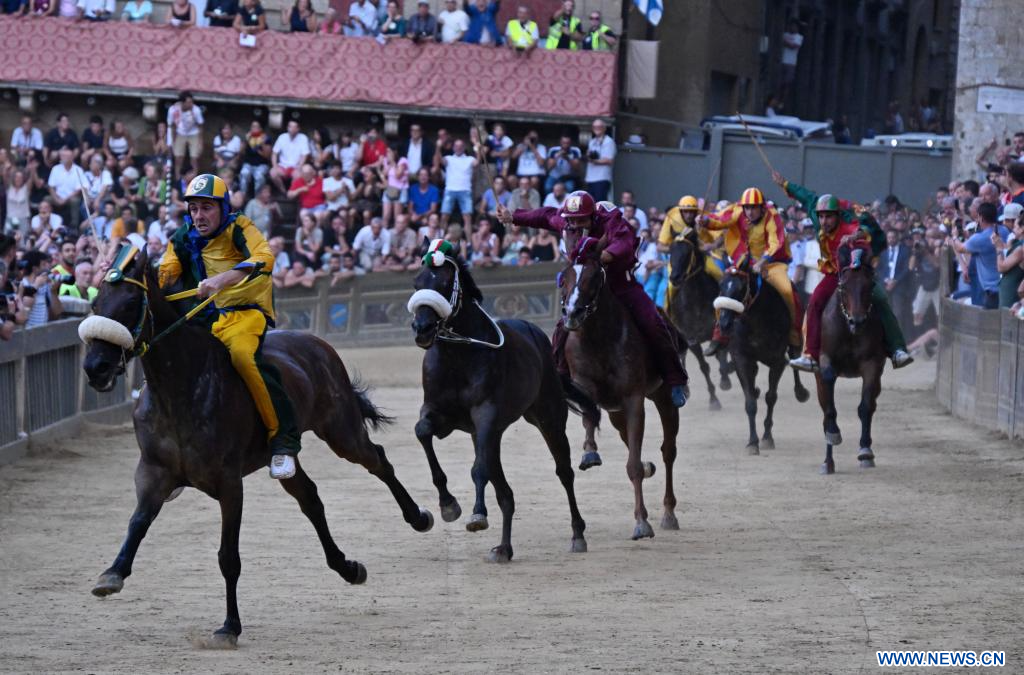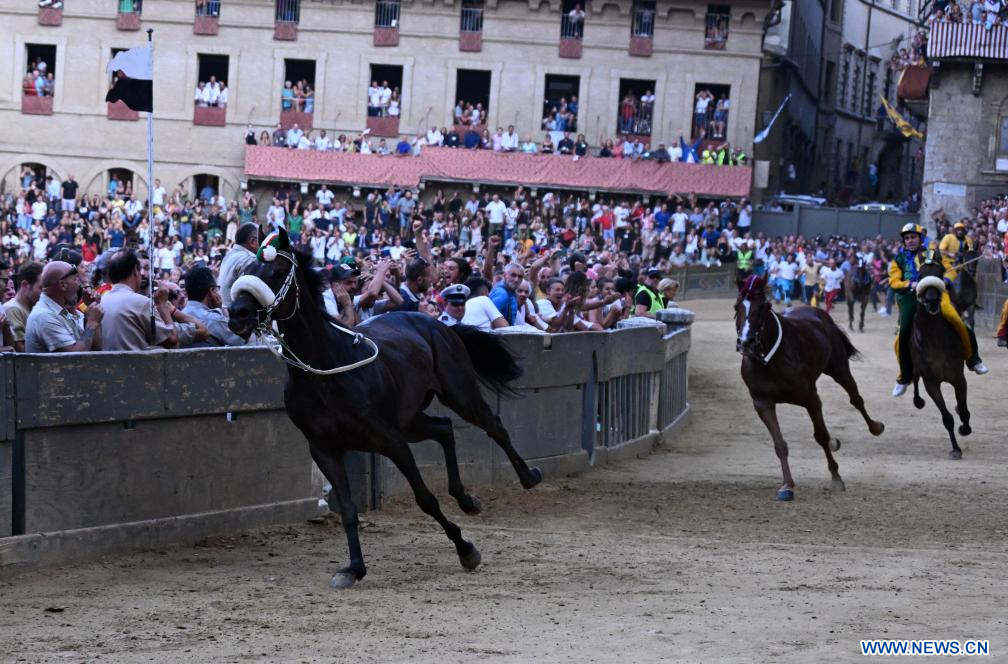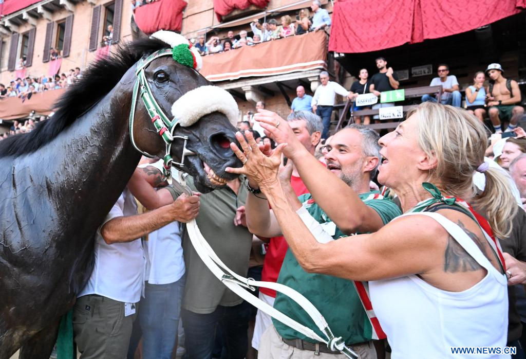 SIENA, 16 agosto, 2023 (Xinhua) -- Personas festejan con el caballo ganador durante el Palio, en Siena, Italia, el 16 de agosto de 2023. El Palio de Siena, o "Palio di Siena" en italiano, es una carrera de caballos histórica que se celebra dos veces al año en Siena desde 1656. (Xinhua/Alberto Lingria)