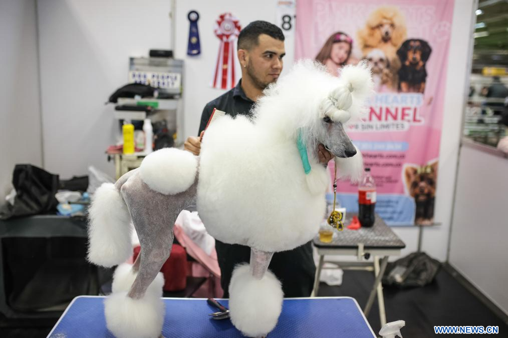 BOGOTA, 19 agosto, 2023 (Xinhua) -- Un hombre prepara a su perro para una competencia durante la octava edición de Expopet, en el recinto ferial Corferias, en Bogotá, Colombia el 19 de agosto de 2023. Miles de personas se dan cita este fin de semana en la capital colombiana para asistir a la octava edición de Expopet, la feria sobre el cuidado de las mascotas más importante del país y que reúne más de 180 expositores de todo lo referente a las denominadas familias multiespecie. (Xinhua/Str)