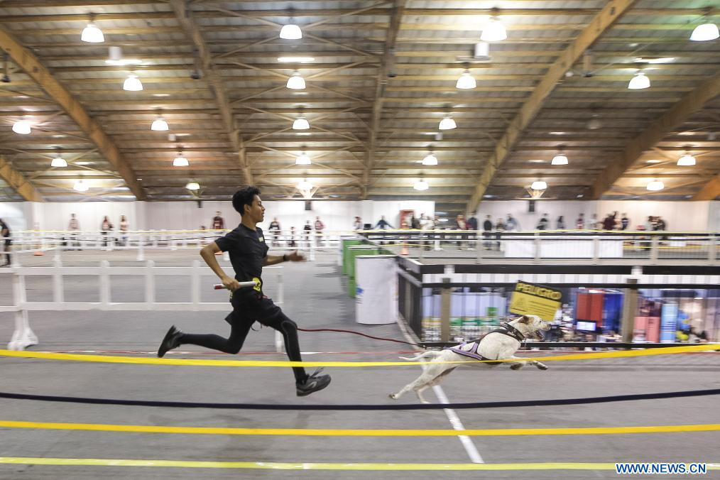 BOGOTA, 19 agosto, 2023 (Xinhua) -- Un hombre y su perro participan en una competencia durante la octava edición de Expopet, en el recinto ferial Corferias, en Bogotá, Colombia el 19 de agosto de 2023. Miles de personas se dan cita este fin de semana en la capital colombiana para asistir a la octava edición de Expopet, la feria sobre el cuidado de las mascotas más importante del país y que reúne más de 180 expositores de todo lo referente a las denominadas familias multiespecie. (Xinhua/Str)