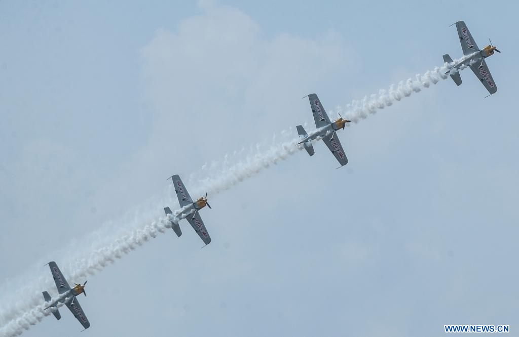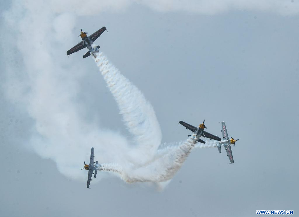 SHENYANG, 18 agosto, 2023 (Xinhua) -- Una presentación acrobática aérea es puesta en escena durante la ceremonia de apertura de la X Conferencia Internacional de Vuelo de Faku, en Shenyang, provincia de Liaoning, en el noreste de China, el 18 de agosto de 2023. (Xinhua/Long Lei)