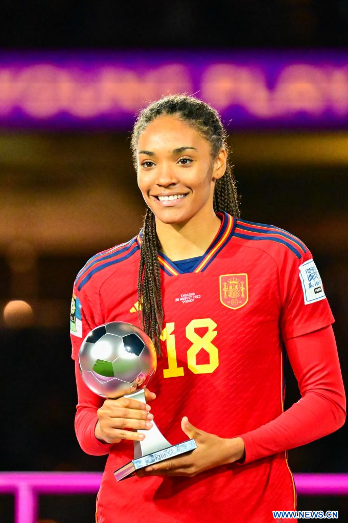 SIDNEY, 20 agosto, 2023 (Xinhua) -- Salma Paralluelo, de España, recibe el premio a Mejor Jugadora Joven, durante la ceremonia de premiación de la Copa Mundial Femenina de la FIFA Australia y Nueva Zelanda 2023, en Sídney, Australia, el 20 de agosto de 2023. (Xinhua/Zhu Wei)