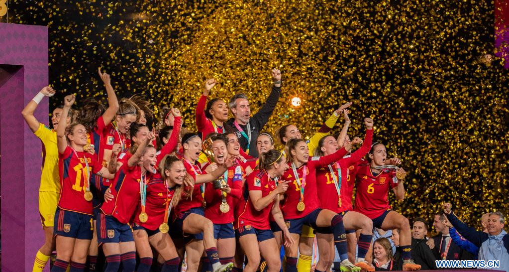 SIDNEY, 20 agosto, 2023 (Xinhua) -- Jugadoras de España festejan durante la ceremonia de premiación de la Copa Mundial Femenina de la FIFA Australia y Nueva Zelanda 2023, en Sídney, Australia, el 20 de agosto de 2023. (Xinhua/Ding Ting)