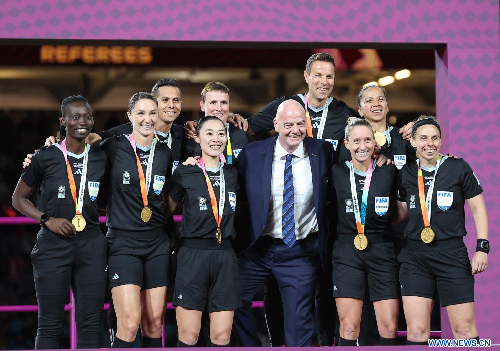 SIDNEY, 20 agosto, 2023 (Xinhua) -- El presidente de la FIFA, Gianni Infantino (3-d-frente), posa con árbitros durante la ceremonia de premiación de la Copa Mundial Femenina de la FIFA Australia y Nueva Zelanda 2023, en Sídney, Australia, el 20 de agosto de 2023. (Xinhua/Ding Xu)
