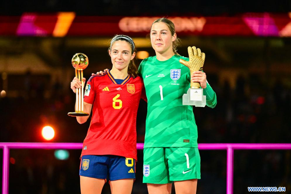 SIDNEY, 20 agosto, 2023 (Xinhua) -- Aitana Bonmati (i), de España, y la guardameta Mary Earps, de Inglaterra, reciben los premios Balón de Oro y Guante de Oro, respectivamente durante la ceremonia de premiación en la Copa Mundial Femenina de la FIFA Australia y Nueva Zelanda 2023, en Sídney, Australia, el 20 de agosto de 2023. (Xinhua/Zhu Wei)