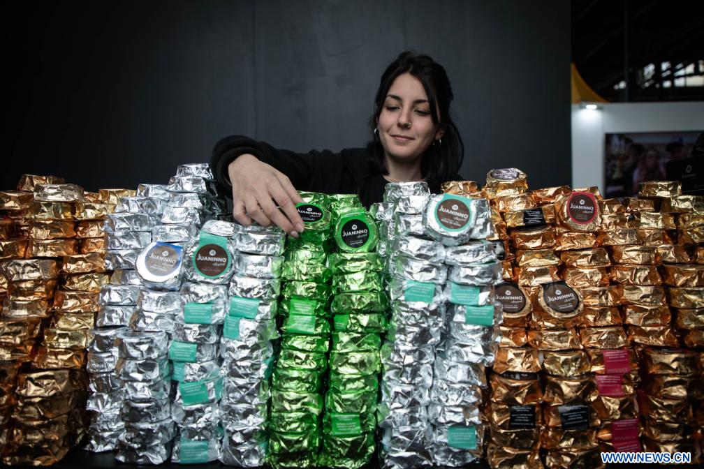 BUENOS AIRES, 19 agosto, 2023 (Xinhua) -- Una empleada acomoda un alfajor de membrillo en un estand durante la Feria Argentina del Alfajor en el marco de la segunda edición del Campeonato Mundial del Alfajor, en la ciudad de Buenos Aires, capital de Argentina, el 19 de agosto de 2023. (Xinhua/Martín Zabala)