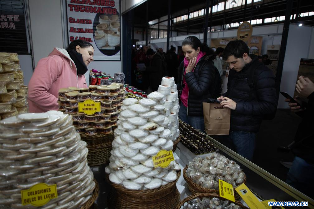 BUENOS AIRES, 19 agosto, 2023 (Xinhua) -- Personas observan los distintos tipos de alfajores en un estand durante la Feria Argentina del Alfajor en el marco de la segunda edición del Campeonato Mundial del Alfajor, en la ciudad de Buenos Aires, capital de Argentina, el 19 de agosto de 2023. (Xinhua/Martín Zabala)