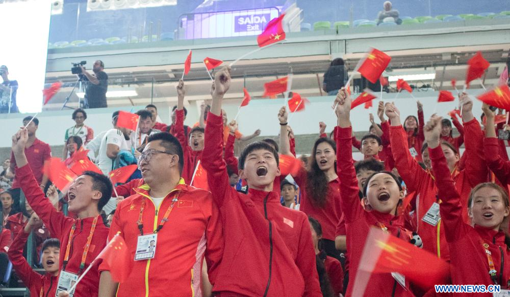 RIO DE JANEIRO, 21 agosto, 2023 (Xinhua) -- Imagen del 20 de agosto de 2023 de miembros de la delegación de China animando durante la ceremonia de apertura de la segunda Gimnasiada Sub-15 de la Federación Internacional de Deporte Escolar (ISF, por sus siglas en inglés), en Río de Janeiro, Brasil. (Xinhua/Wang Tiancong)