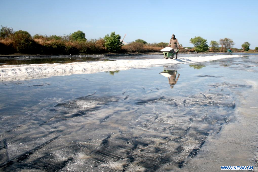 Agricultores cosechan sal, en la aldea Tambak Cemandi, en Sidoarjo, Java Oriental, Indonesia, el 31 de julio de 2023. (Xinhua/Sahlan Kurniawan)
