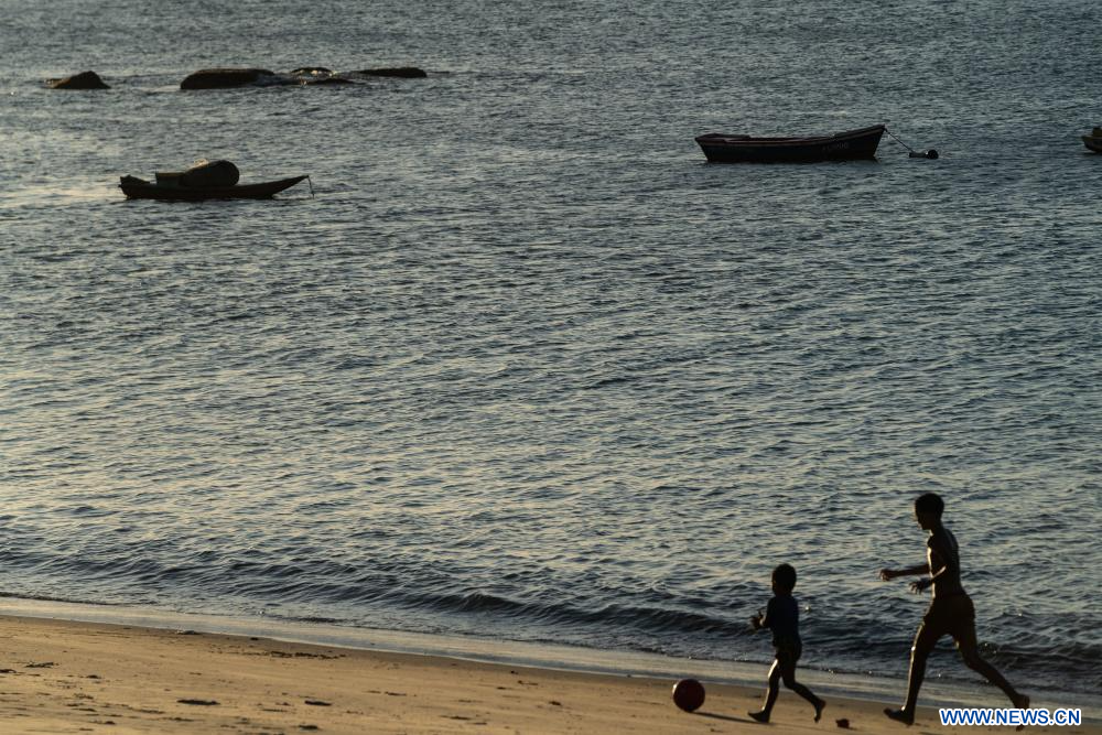 CEARA, 9 agosto, 2023 (Xinhua) -- Imagen del 8 de agosto de 2023 de dos niños jugando fútbol en una playa, en Fortaleza, Brasil. (Xinhua/Wang Tiancong)