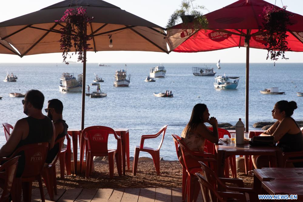 CEARA, 9 agosto, 2023 (Xinhua) -- Imagen del 8 de agosto de 2023 de personas sentadas en un restaurante junto al mar, en Fortaleza, Brasil. (Xinhua/Wang Tiancong)