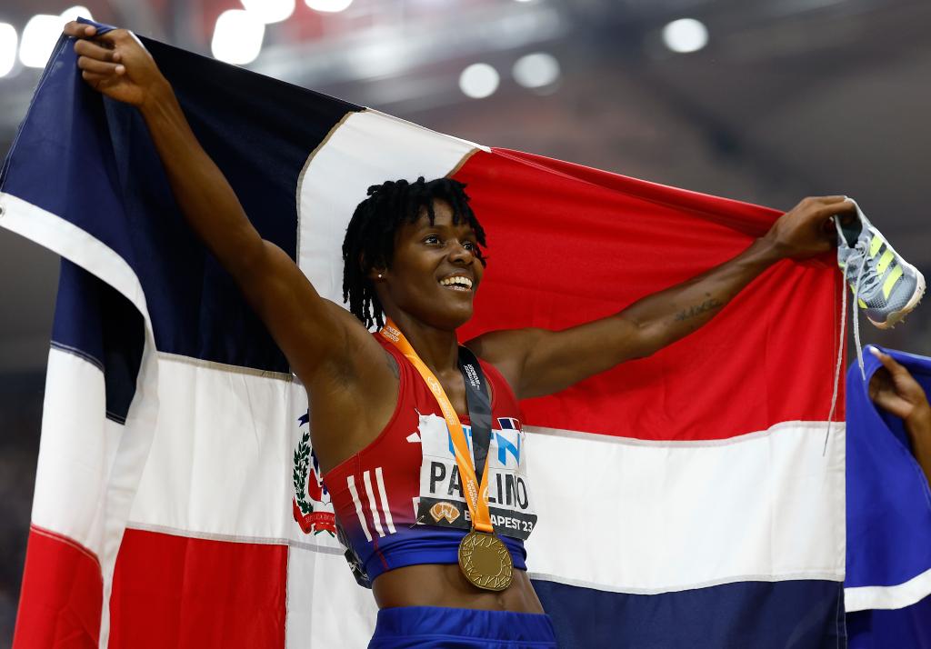 BUDAPEST, 24 agosto, 2023 (Xinhua) -- Imagen del 23 de agosto de 2023 de Marileidy Paulino, de República Dominicana, festejando después de ganar la final femenina de 400m del Campeonato del Mundo de Atletismo de Budapest 2023, en Budapest, Hungría. (Xinhua/Wang Lili)