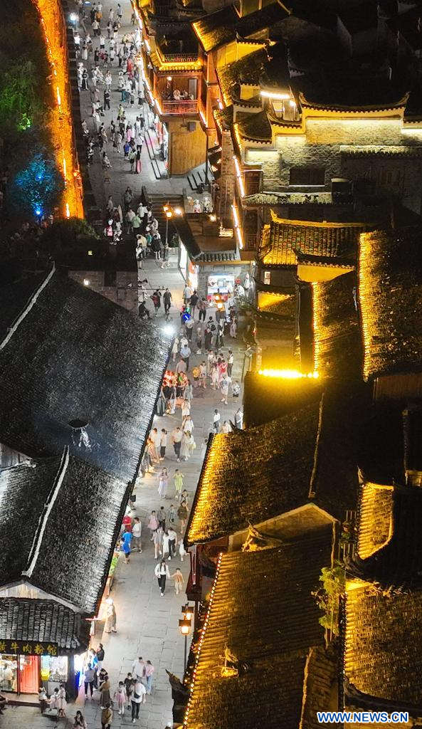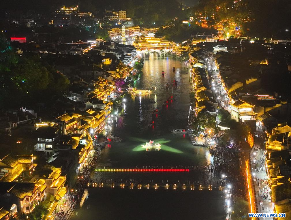 XIANGXI, 26 agosto, 2023 (Xinhua) -- Vista aérea del 25 de agosto de 2023 de una vista nocturna en el antiguo poblado de Fenghuang, en la prefectura autónoma tujia y miao de Xiangxi, en la provincia de Hunan, en el centro de China. (Xinhua/Zhao Zhongzhi)
