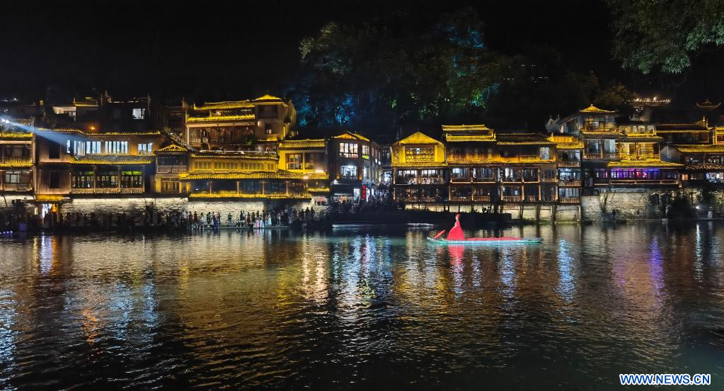 XIANGXI, 26 agosto, 2023 (Xinhua) -- Imagen del 25 de agosto de 2023 de una vista nocturna en el antiguo poblado de Fenghuang, en la prefectura autónoma tujia y miao de Xiangxi, en la provincia de Hunan, en el centro de China. (Xinhua/Zhao Zhongzhi)