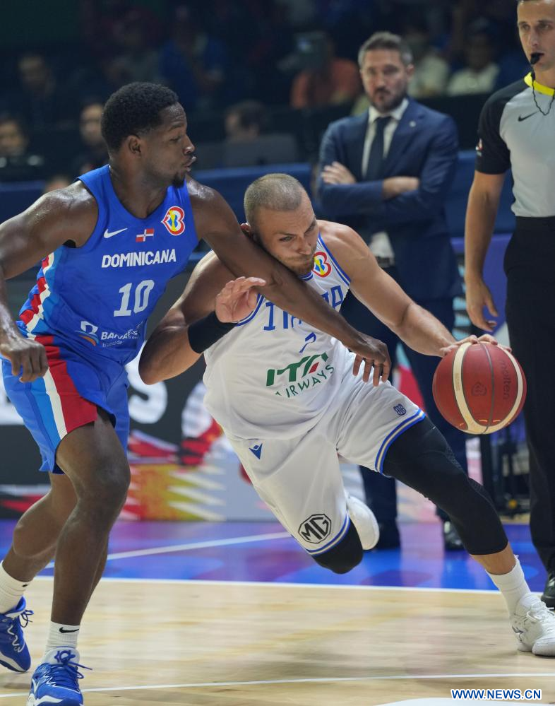 MANILA, 27 agosto, 2023 (Xinhua) -- Stefano Tonut (d), de Italia, disputa el balón con Andrés Feliz, de República Dominicana, durante el partido del Grupo A entre República Dominicana e Italia en la Copa Mundial de la FIBA 2023, en Manila, Filipinas, el 27 de agosto de 2023. (Xinhua/Meng Yongmin)