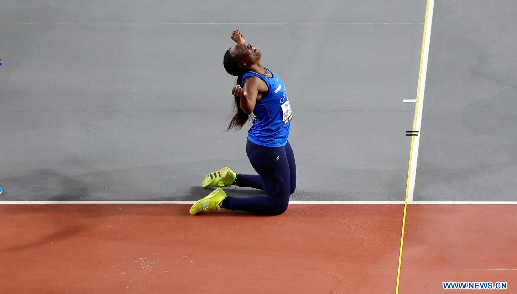 BUDAPEST, 26 agosto, 2023 (Xinhua) -- Imagen del 25 de agosto de 2023 de Yulimar Rojas, de Venezuela, reaccionando después de ganar la final femenina de salto triple del Campeonato del Mundo de Atletismo de Budapest 2023, en Budapest, Hungría. (Xinhua/Wang Lili)