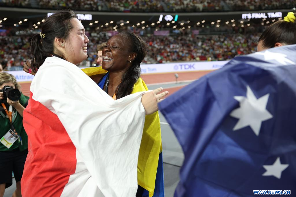 BUDAPEST, 26 agosto, 2023 (Xinhua) -- Imagen del 25 de agosto de 2023 de la medallista de oro, Kitaguchi Haruka (i), de Japón, festejando con la medallista de plata, Flor Denis Ruiz Hurtado, de Colombia, después de la final femenina de lanzamiento de jabalina durante el Campeonato del Mundo de Atletismo de Budapest 2023, en Budapest, Hungría. (Xinhua/Li Ming)