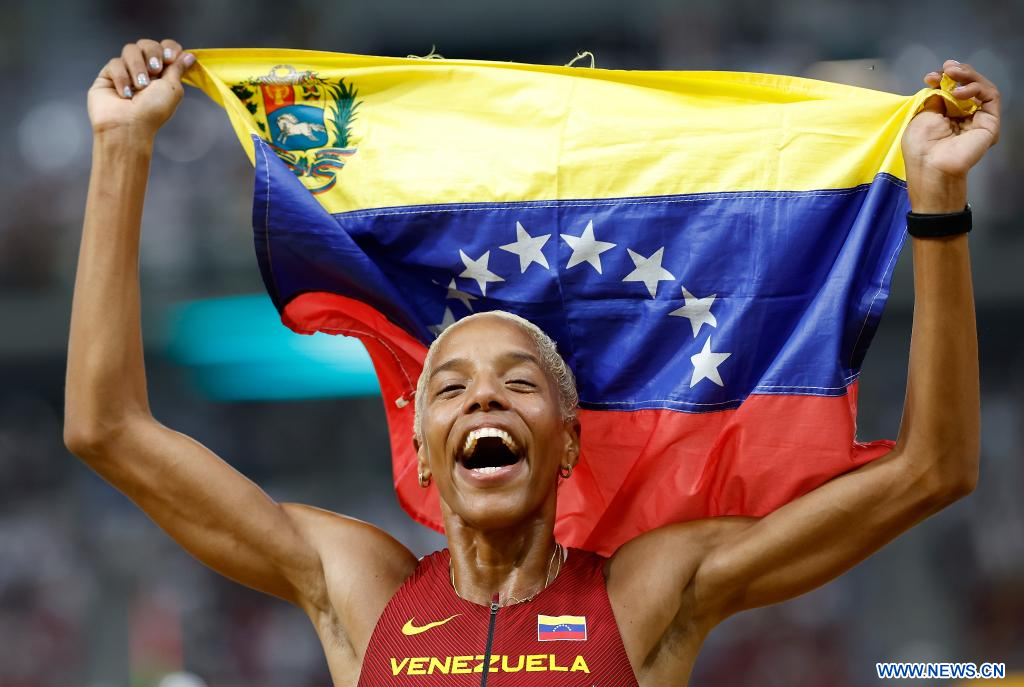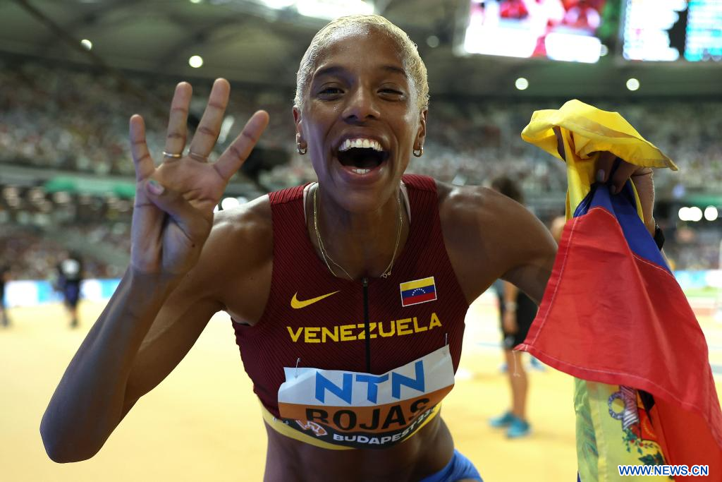 BUDAPEST, 26 agosto, 2023 (Xinhua) -- Imagen del 25 de agosto de 2023 de Yulimar Rojas, de Venezuela, festejando después de ganar la final femenina de salto triple del Campeonato del Mundo de Atletismo de Budapest 2023, en Budapest, Hungría. (Xinhua/Wang Lili)