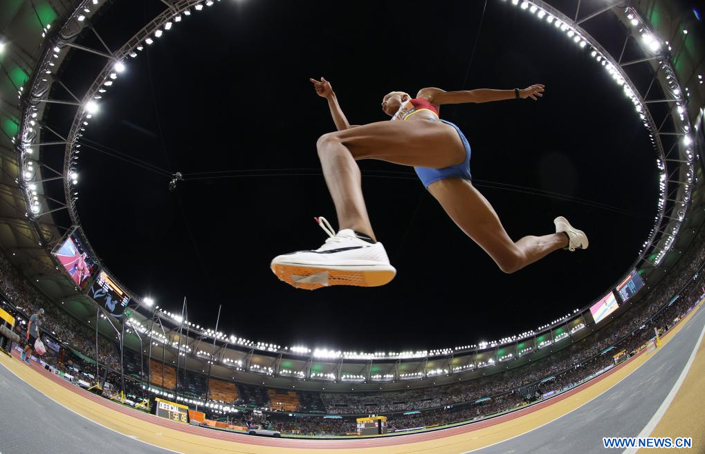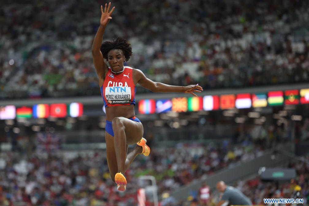 BUDAPEST, 26 agosto, 2023 (Xinhua) -- Imagen del 25 de agosto de 2023 de Leyanis Pérez Hernández, de Cuba, compitiendo durante la final femenina de salto triple del Campeonato del Mundo de Atletismo de Budapest 2023, en Budapest, Hungría. (Xinhua/Li Ming)