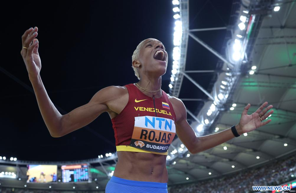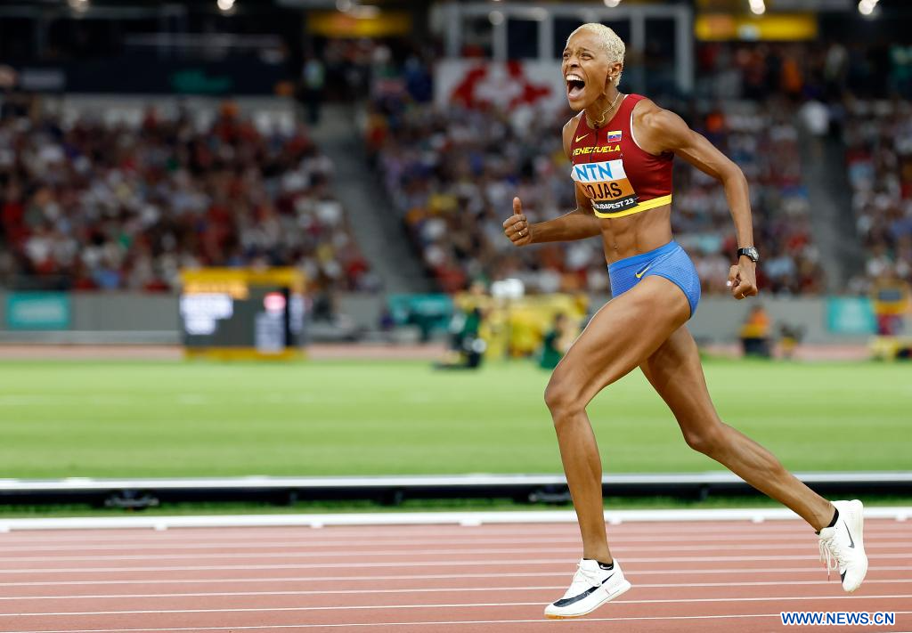 BUDAPEST, 26 agosto, 2023 (Xinhua) -- Imagen del 25 de agosto de 2023 de Yulimar Rojas, de Venezuela, reaccionando después de ganar la final femenina salto triple del Campeonato del Mundo de Atletismo de Budapest 2023, en Budapest, Hungría. (Xinhua/Li Ming)